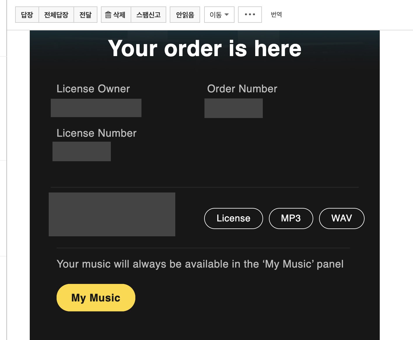 음원을 다운로드 하면 메일로 라이센스가 도착합니다. 이렇게 이메일로 라이센스를 보내주니 나중에 라이센스로 인해서 분쟁이 생겼을 때 원만하게 해결할 수 있을거라는 마음이 생기네요.