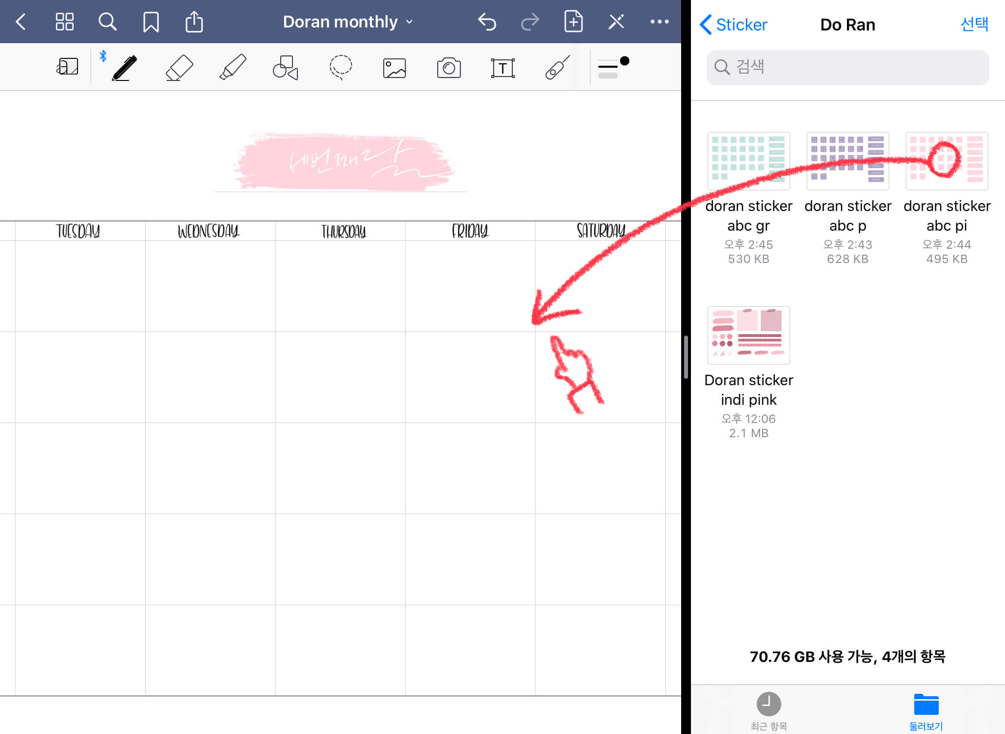 아이패드의 [파일] 폴더에서 바로 사용하는 방법입니다. (굿노트 스티커 사용 방법은 굉장히 다양해요)