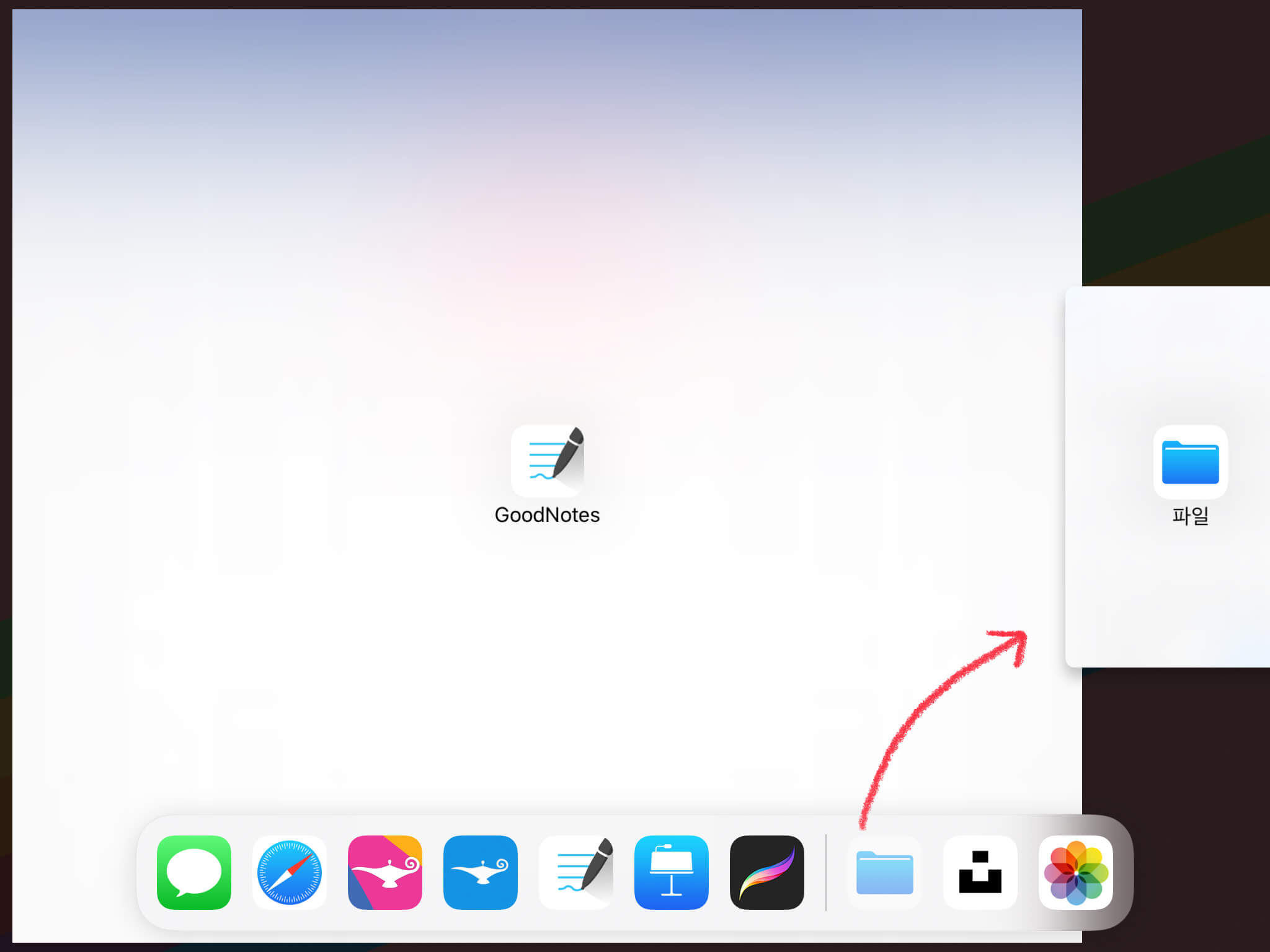 아이패드는 아래에서 위로 살짝 밀어주면 [Dock]이라는 화면이 나옵니다. (그중에 파일 아이콘이 없을 경우에는, 바탕화면으로 가서 파일을 한번 실행해주세요. 최근 사용한 어플이 아래에 표시됩니다.)