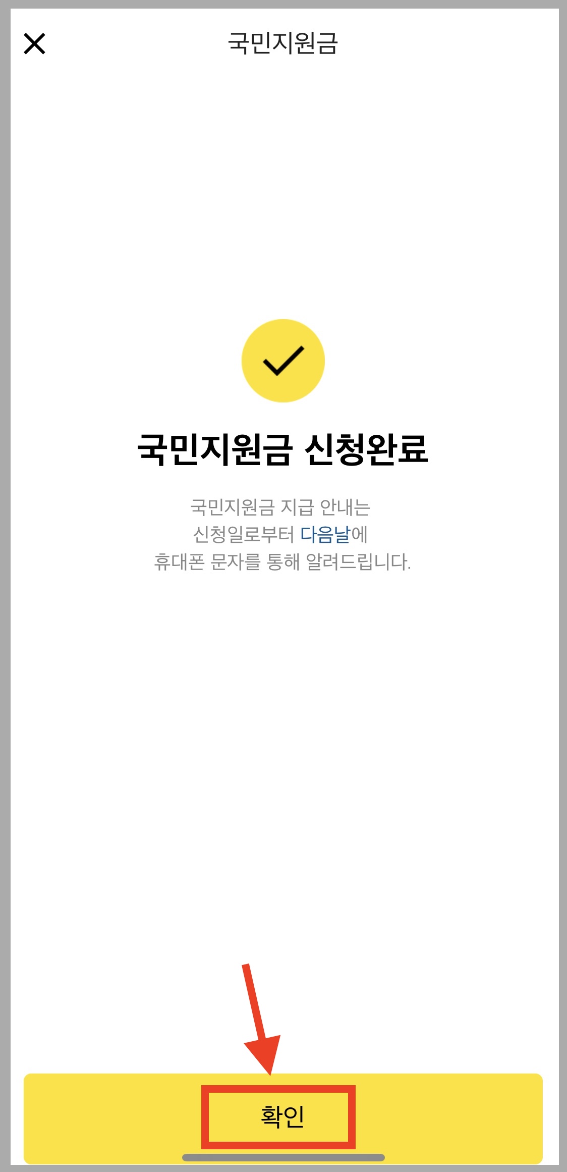 ▼ 이렇게 국민지원금 신청이 완료된 것을 확인하고 [확인] 버튼을 누르면 끝입니다.