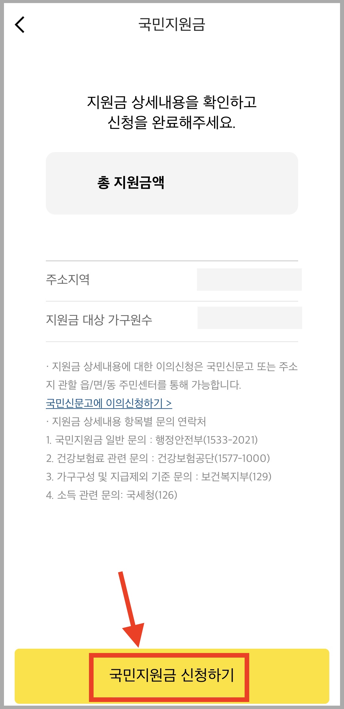 ▼ 본인이 받을 지원금을 확인하고 [국민지원금 신청하기]를 누릅니다.
