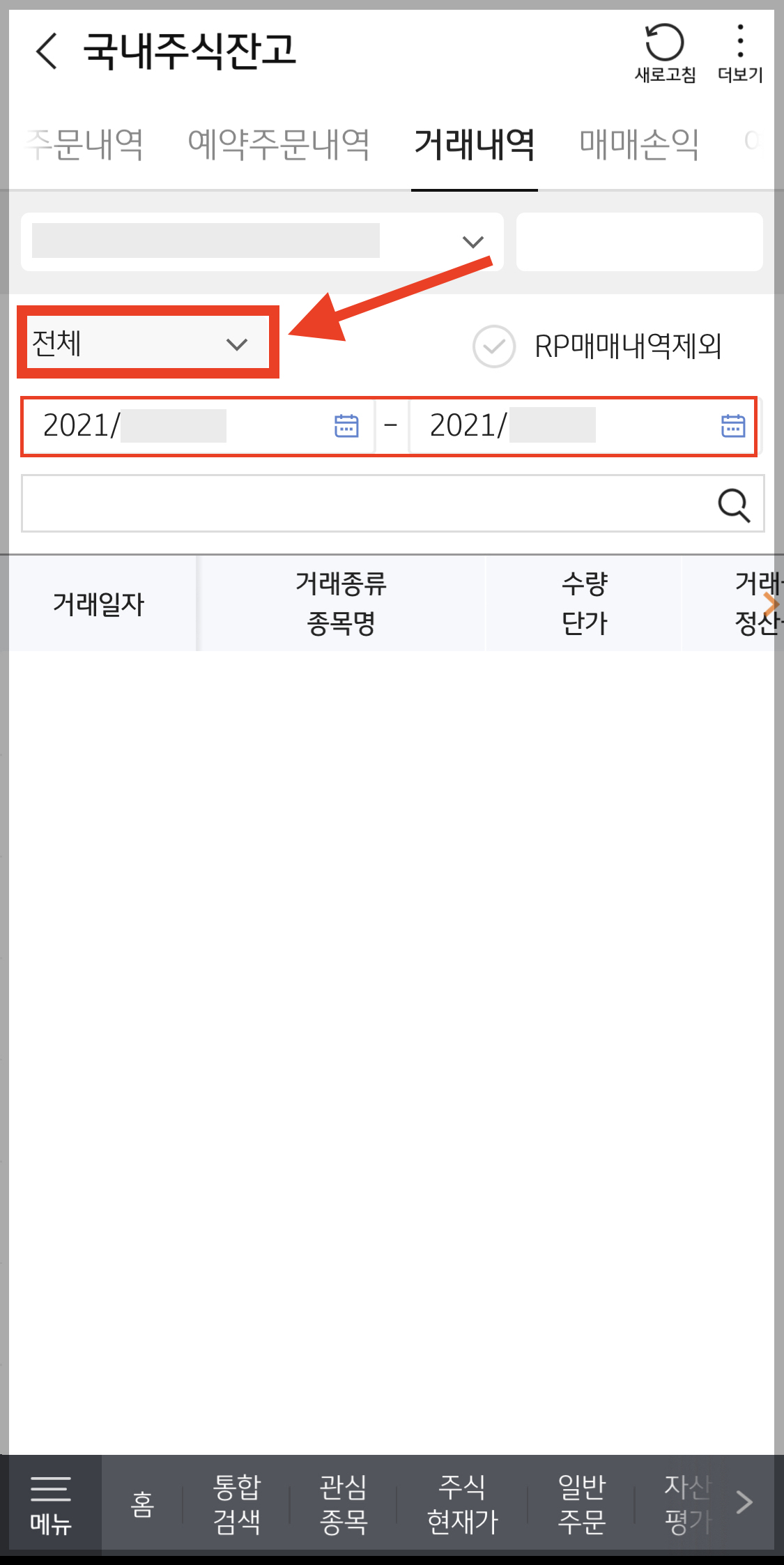 [국내 주식]을 선택하고, 오른쪽 메뉴 중에 국내주식잔고 하위에 있는 [거래 내역]을 선택합니다. (홈화면에서 [자산평가] - [거래내역] 으로도 들어올 수도 있습니다.)