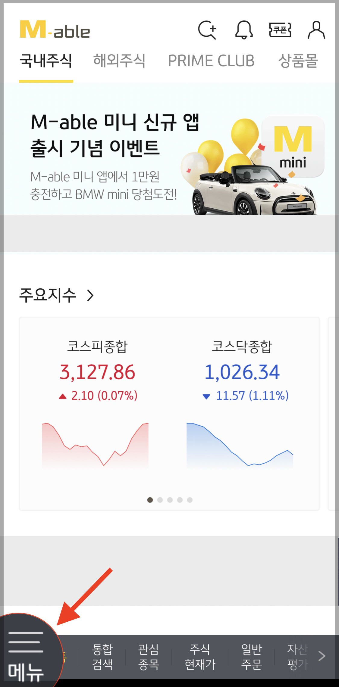 ▼ 먼저 모바일 어플에 접속한 뒤 홈 화면에서 왼쪽 아래에 있는 [메뉴]버튼을 선택합니다.