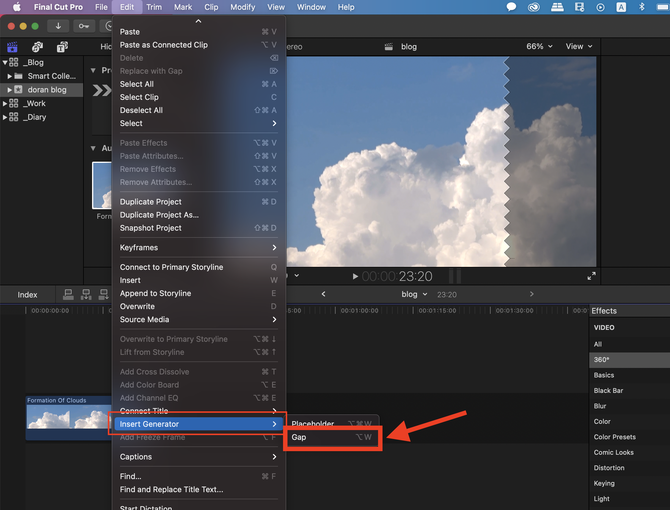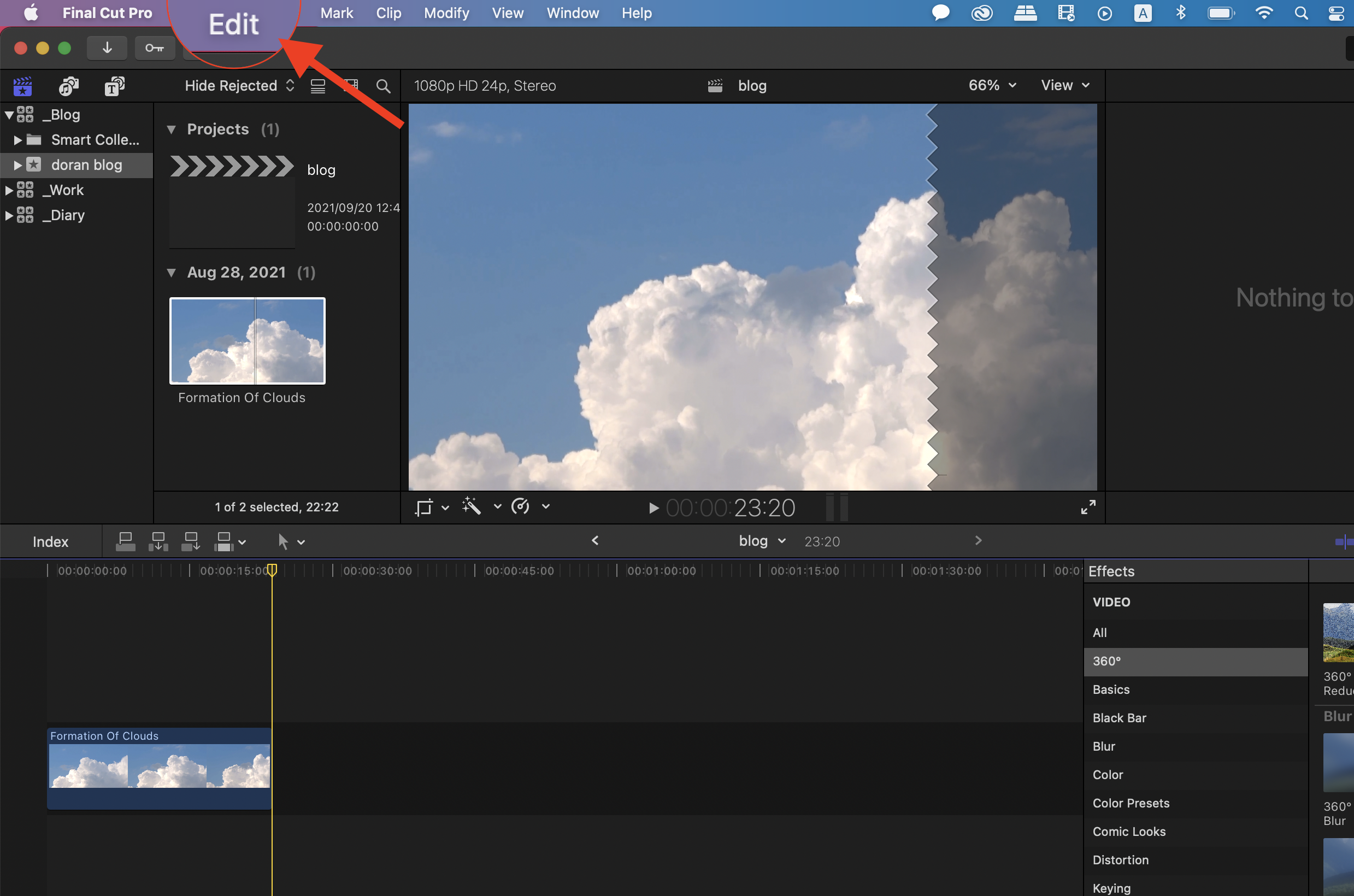 ▼ 빈 공간을 넣어주기 위해서 파이널 컷 상단 메뉴에 [Edit]메뉴를 눌러줍니다.