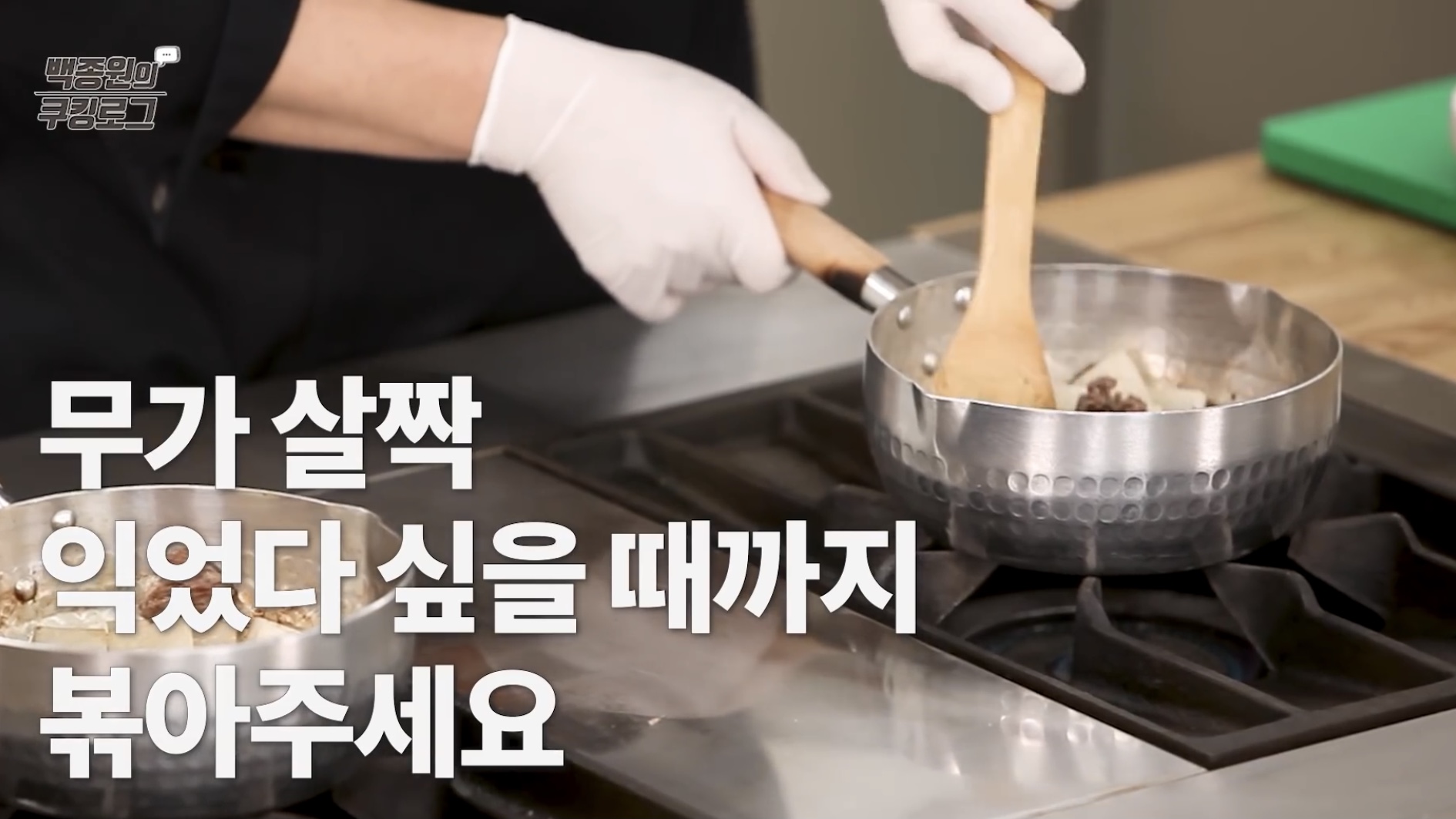 ▼ 그리고 썰어놓은 무를 넣어줍니다. 고기가 처음에는 눌어붙다가 무가 들어가면 수분이 나와서 잘 볶아진다고 합니다.