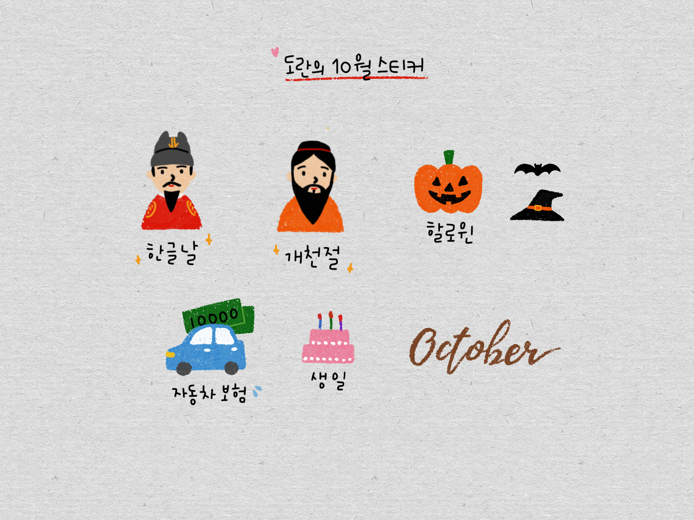 안녕하세요 도란입니다. 오늘은 아이패드 굿노트에서 사용할 수 있는 10월 다이어리 스티커를 가지고 왔습니다. ㅎㅎㅎ 조금 조촐한(?) 스티커지만 다른 달 스티커보다 더욱 열심히 그려보았답니다.