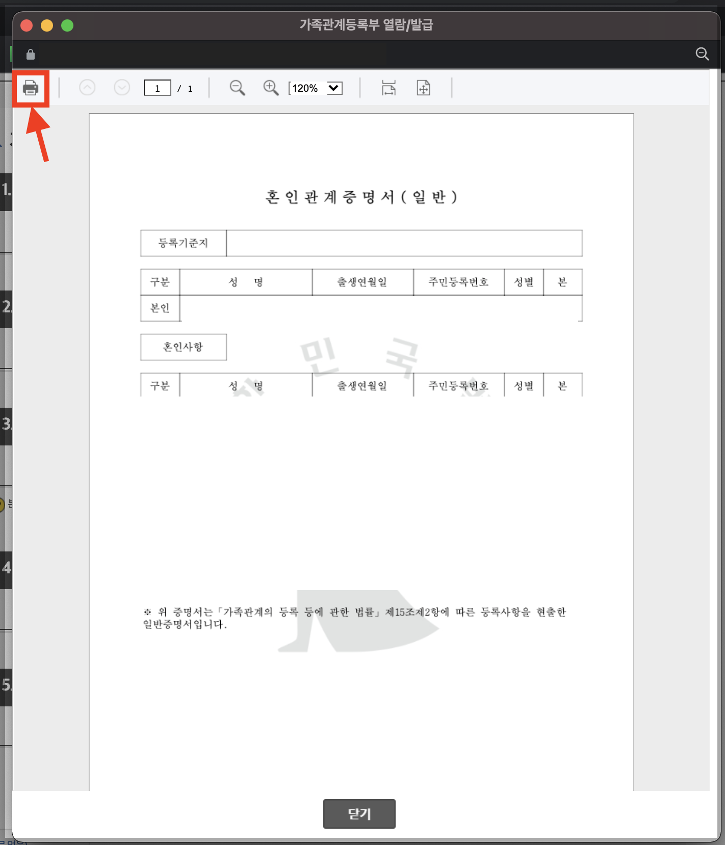 ▼ 아래와 같이 혼인관계증명서 서류가 발급되었습니다. 왼쪽 상단의 프린트 버튼을 눌러서 바로 출력할 수 있습니다.