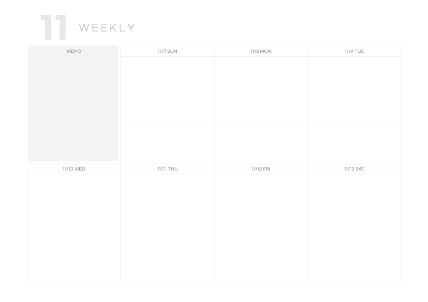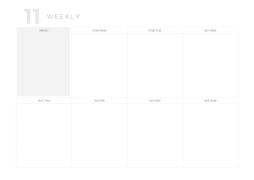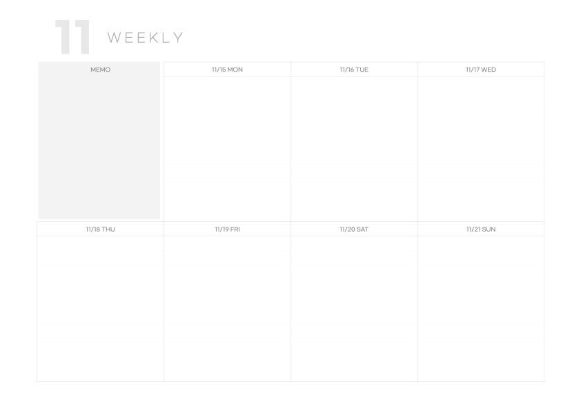 하이퍼링크 다이어리 속지는 월요일 시작 버전과 일요일 시작 버전이 있습니다. 이번 11월은 총 5주입니다. 원하는 버전으로 선택한 뒤 다운로드하면 됩니다. 하이퍼링크는 먼슬리 가장 왼쪽의 회색, 그리고 위클리 상단 숫자에 있습니다.