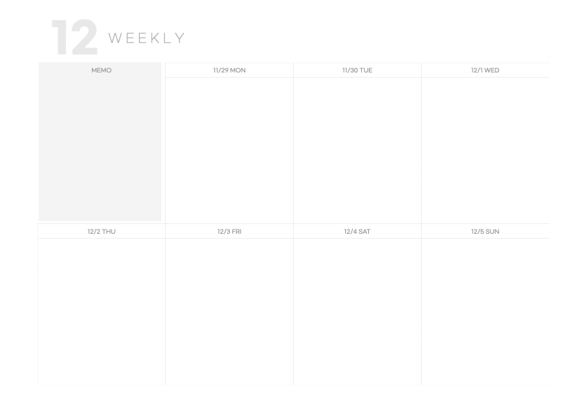 안녕하세요 도란입니다. 오늘은 아이패드 노트 어플 굿노트에서 사용할 수 있는 12월 다이어리 속지를 가지고 왔습니다. 먼슬리 다이어리 1장과 위클리 다이어리 속지 5장으로 되어있습니다. 월요일 시작 버전과 일요일 시작 버전이 있습니다 :) 취향대로 다운로드하면 될 것 같습니다.