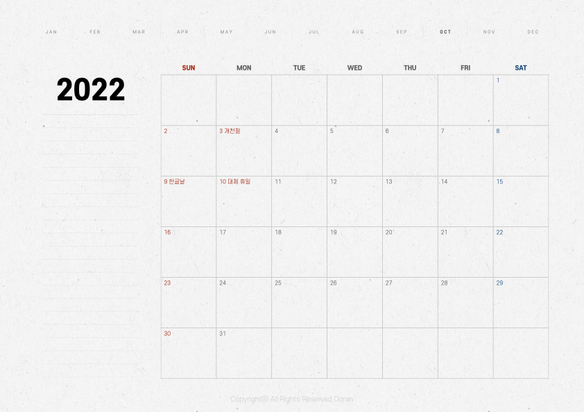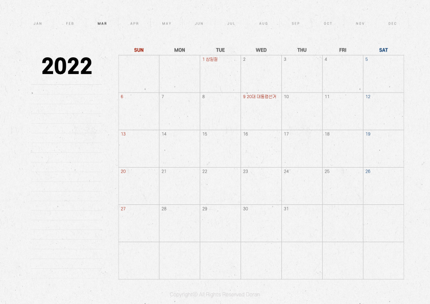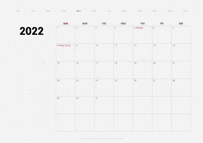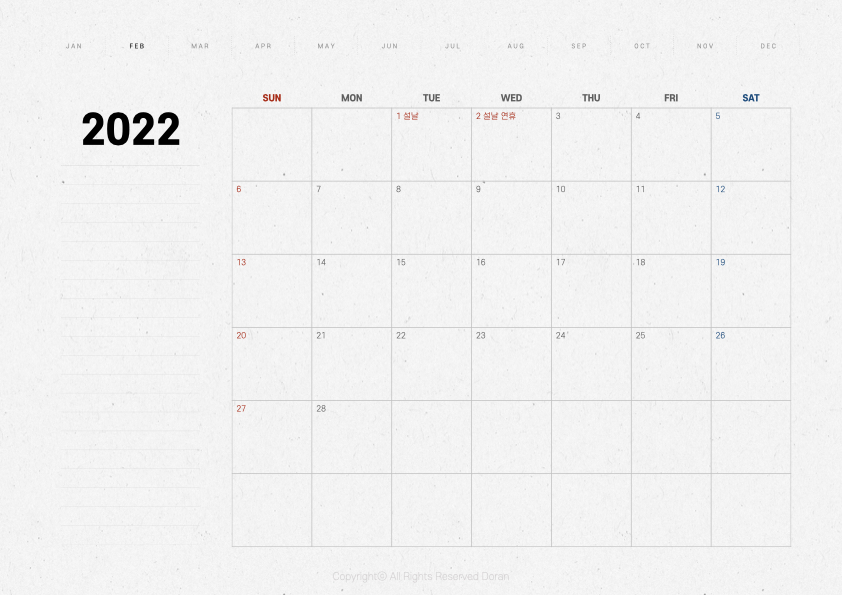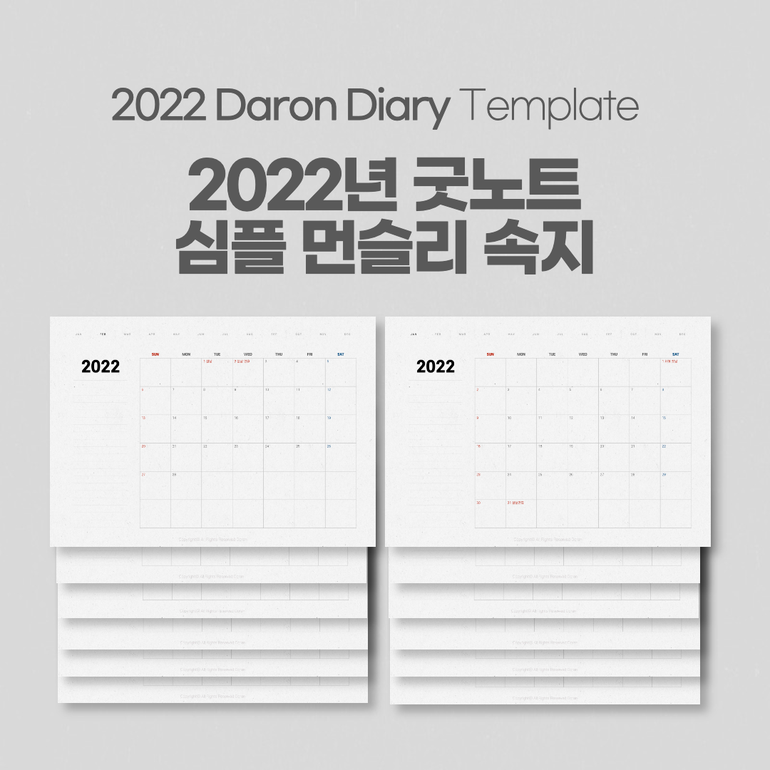 오늘 만들어 온 속지는 2021년 버전과 거의 동일합니다. 표 크기가 6주로 바뀌었고 년도 위치가 조금 올라갔다는 정도 빼면 동일한 디자인이라고 생각하시면 됩니다. 페이퍼 질감의 다이어리 속지를 좋아하는 분들이 있기에 따로 이렇게 만들어 보았습니다.