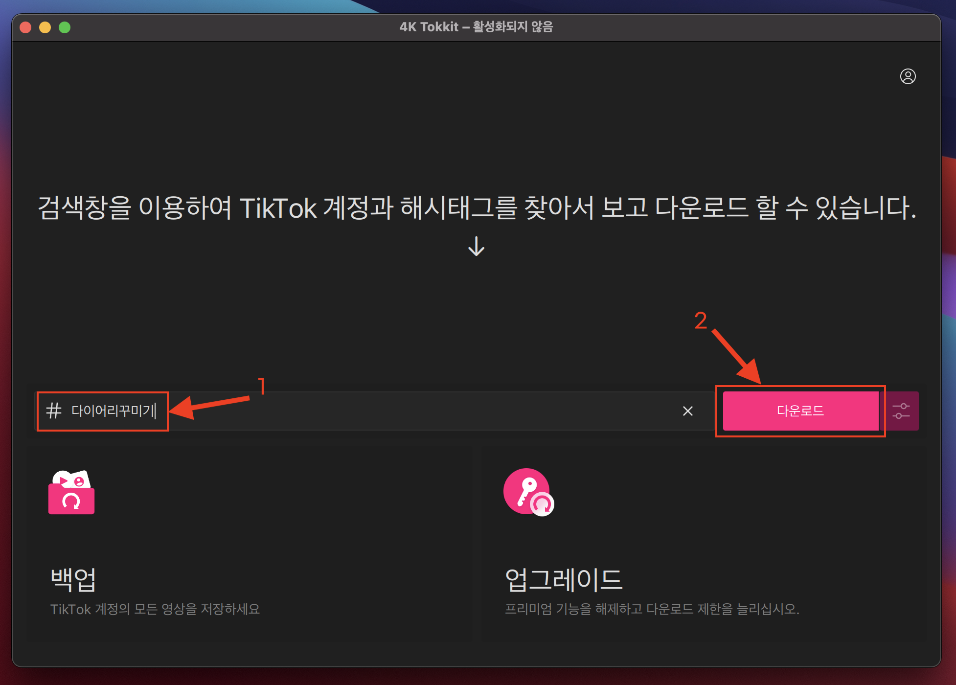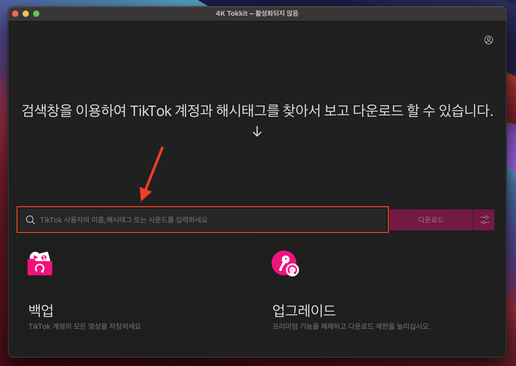 4K 톡킷은 사용 방법이 직관적이고 간단합니다. 다운로드하고자 하는 사용자의 이름, 해시태그, 또는 사운드를 검색어에 입력하고 다운로드 버튼만 누르면 됩니다.