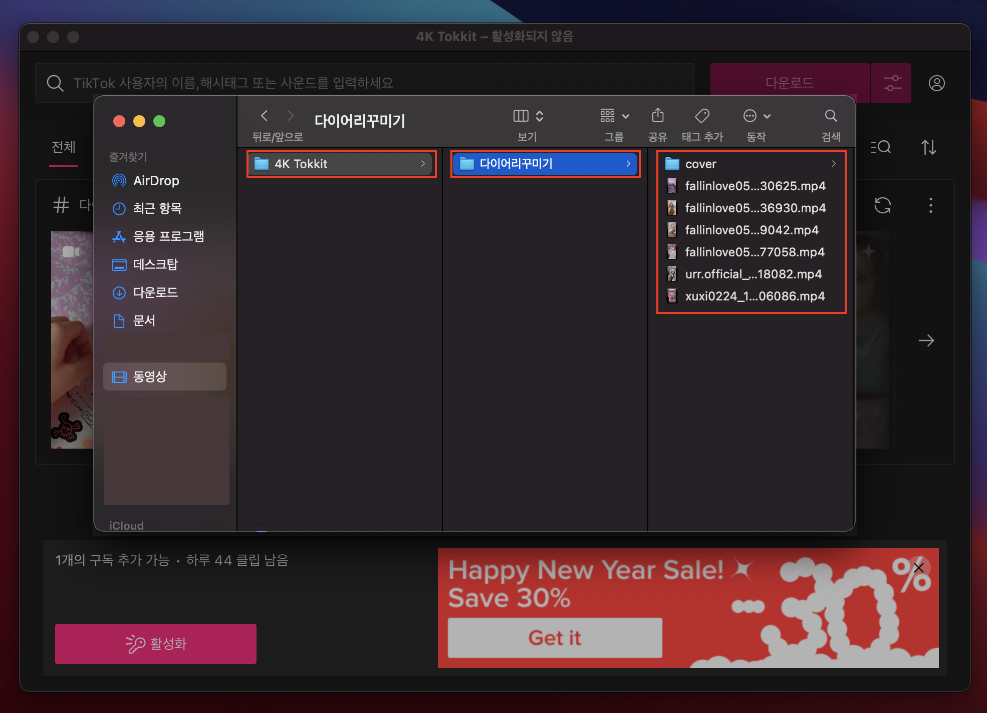 ▼ 아래와 같이 동영상 폴더에 자동으로 4K Tokkit 폴더가 생성 되고, 하위 폴더에 검색어로 된 폴더가 하나 더 생성됩니다. 폴더를 선택하면 다운로드된 틱톡 동영상들을 확인할 수 있습니다. 커버 사진도 따로 저장이 되어있습니다.