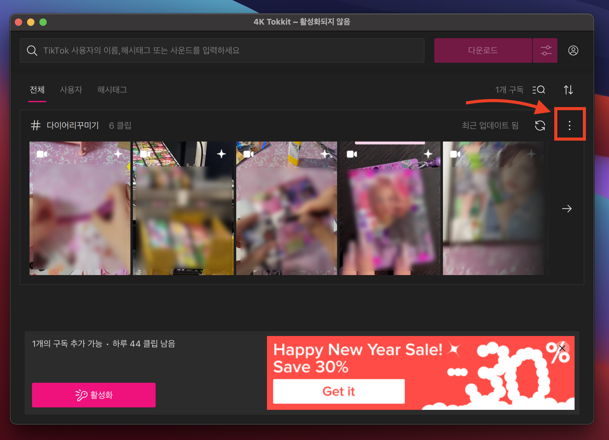 ▼ 무료로 다운로드할 수 있는 동영상의 개수는 총 50개입니다. 중간에 다운로드를 멈출 수도 있습니다. 다운로드된 동영상을 확인하기 위해서는 게시물들 오른쪽 상단에 있는 점 세 개 버튼을 누릅니다.