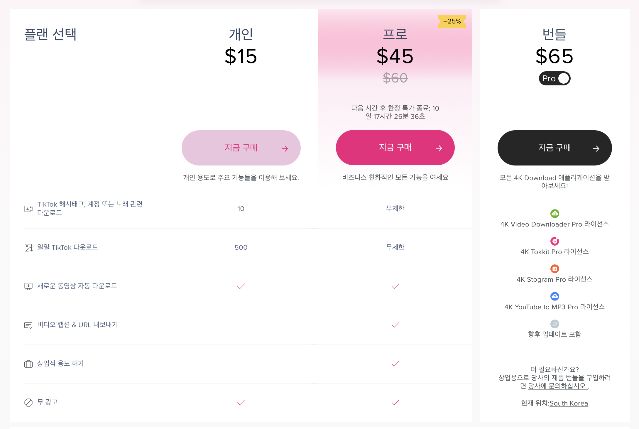 4K Download 회사에서는 유튜브 동영상 다운로드 프로그램, 유튜브 mp4 추출 프로그램, 인스타그램 사진 동영상 다운로드 프로그램 등 다양한 프로그램을 제공하고 있습니다. 이 모든 프로그램을 번들로 한꺼번에 구매할 수 있는 요금도 있습니다.