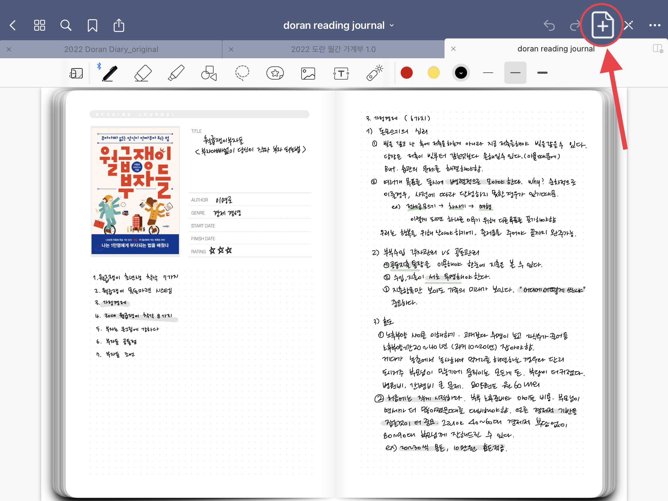 ▼ 굿노트 오른쪽 상단에 페이지 추가 버튼이 있습니다. 추가 버튼을 눌러주세요.