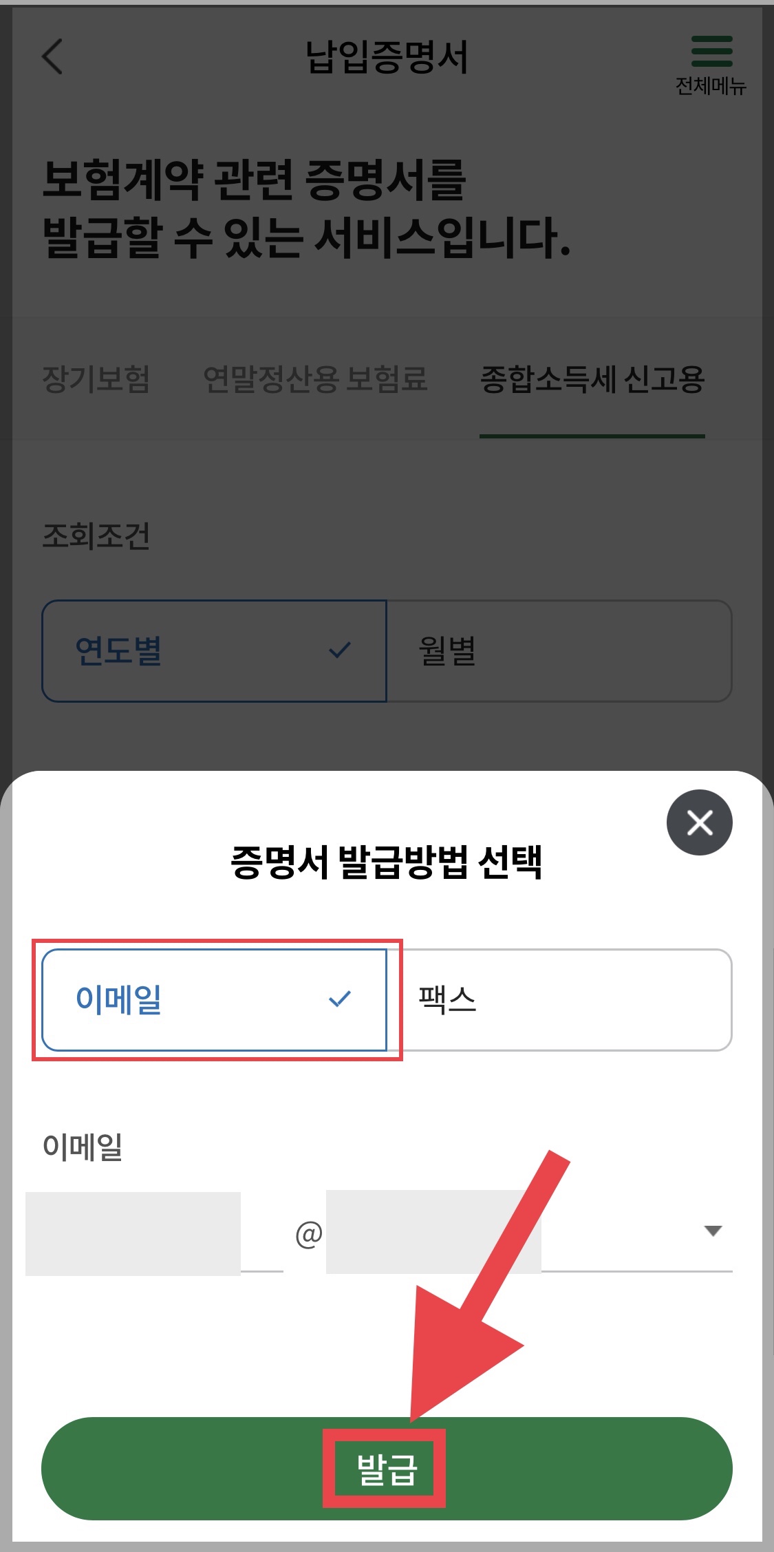 ▼ 상단에 연말정산용 보험료 혹은 종합소득세 신고용을 선택할 수 있습니다. 필요한 종류를 선택하고 연도별 기준을 선택한 뒤 조회를 누릅니다. 그리고 [발급] 버튼을 눌러줍니다.