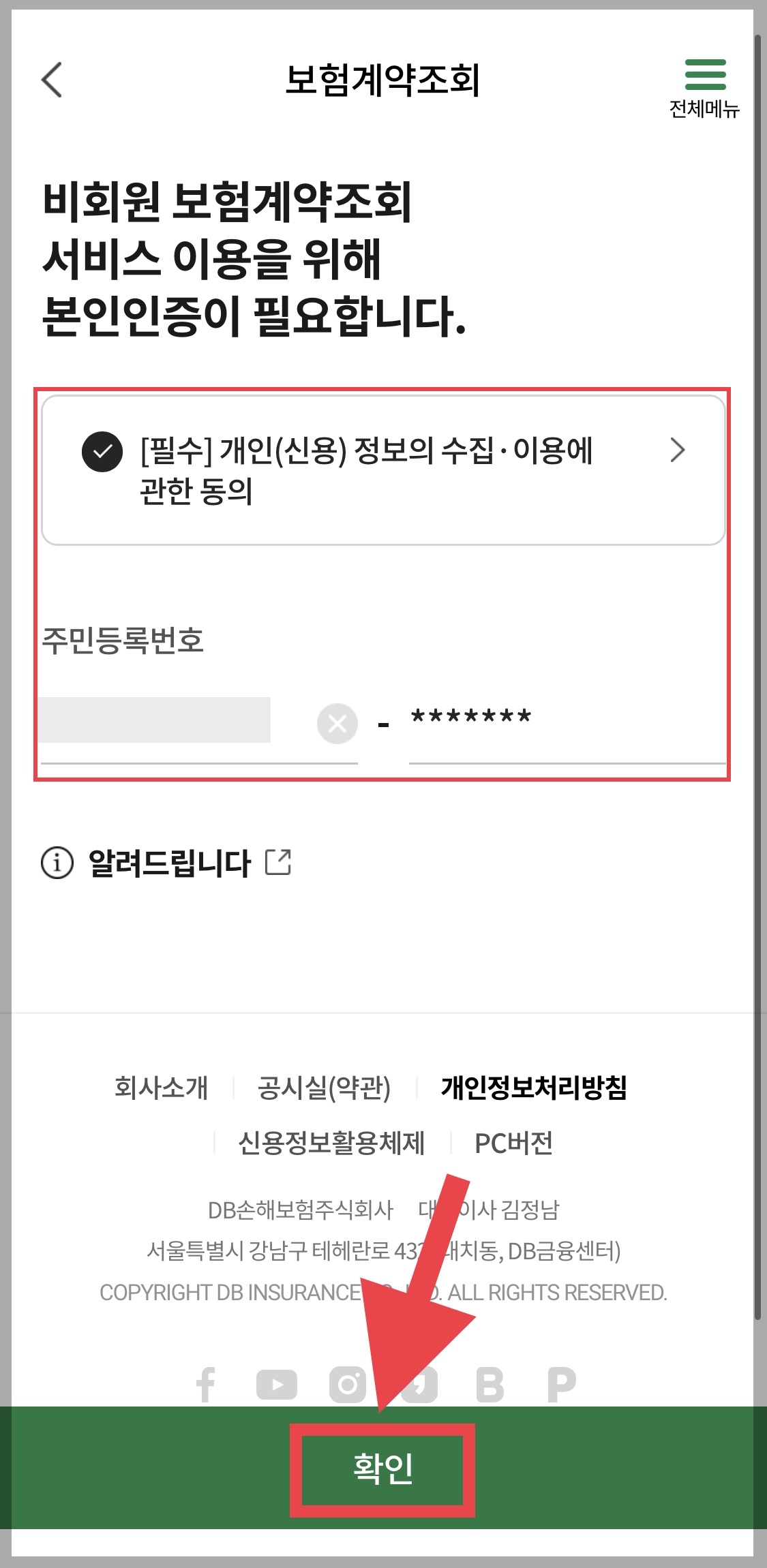 ▼ 개인정보 수집 이용에 관한 동의를 한 뒤, 주민등록 번호를 입력하고 [확인]을 누릅니다.