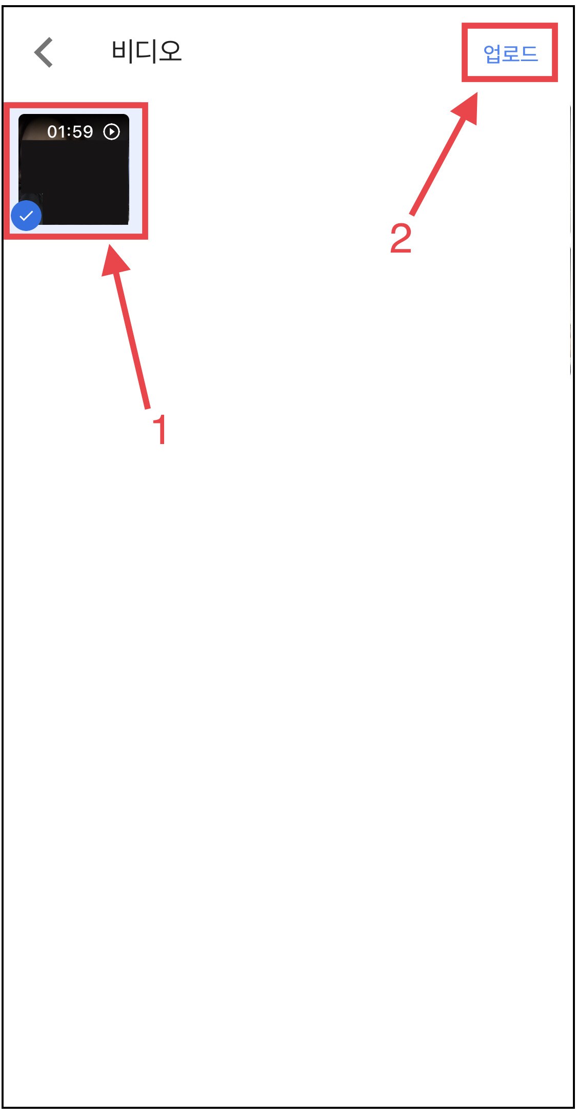 ▼ 업로드할 비디오를 선택한 뒤 오른쪽 상단에 있는 [업로드]를 누릅니다.