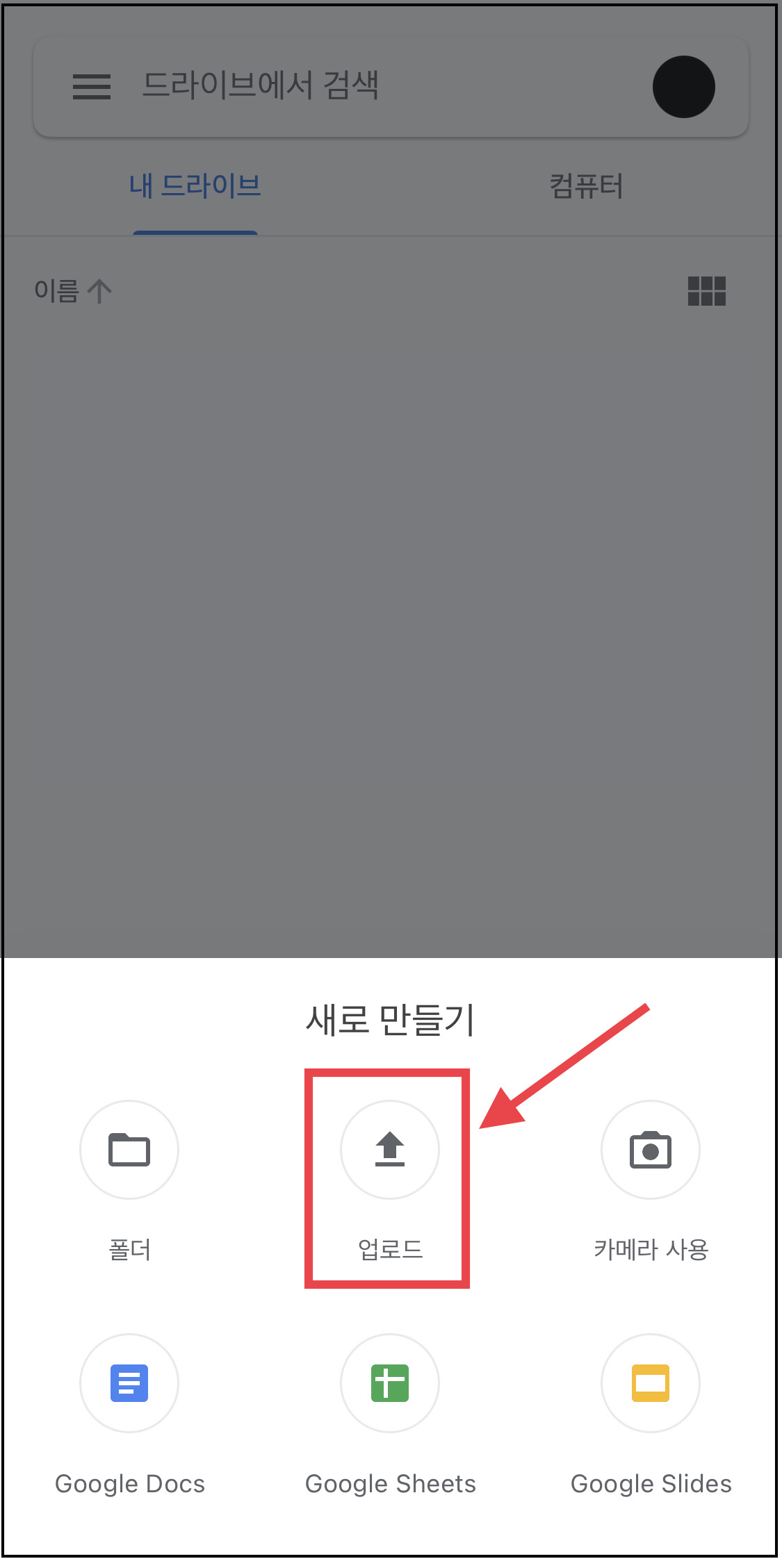 ▼ 아래와 같이 아래에서 [새로 만들기]라는 팝업창이 나오면, [업로드] 메뉴를 선택합니다.