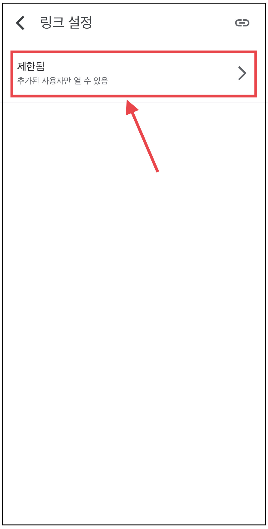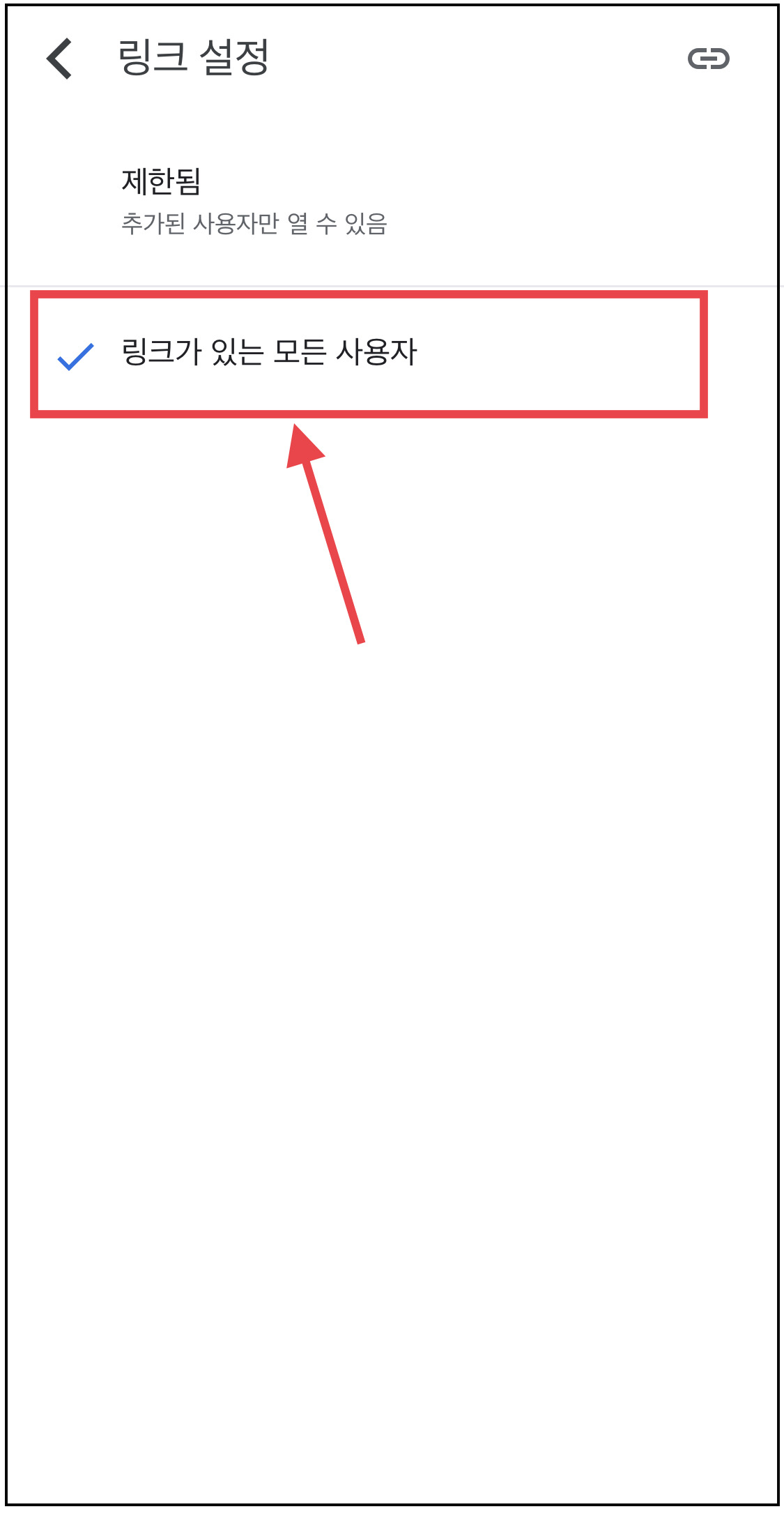 ▼ 아래 제한됨으로 되어있는 설정을 [링크가 있는 모든 사용자]로 변경해줍니다.