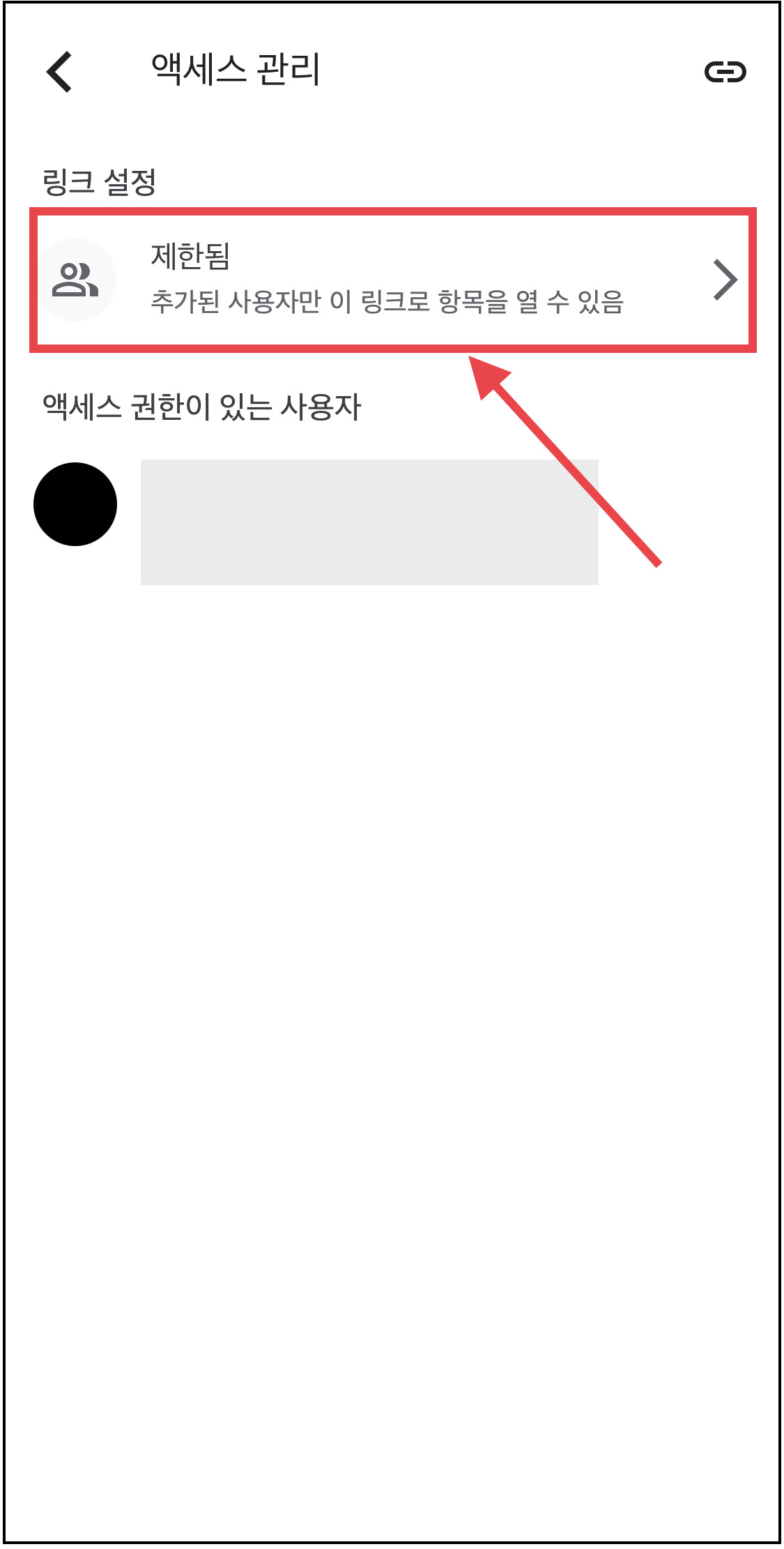 ▼ 아래 제한됨으로 되어있는 설정을 [링크가 있는 모든 사용자]로 변경해줍니다.