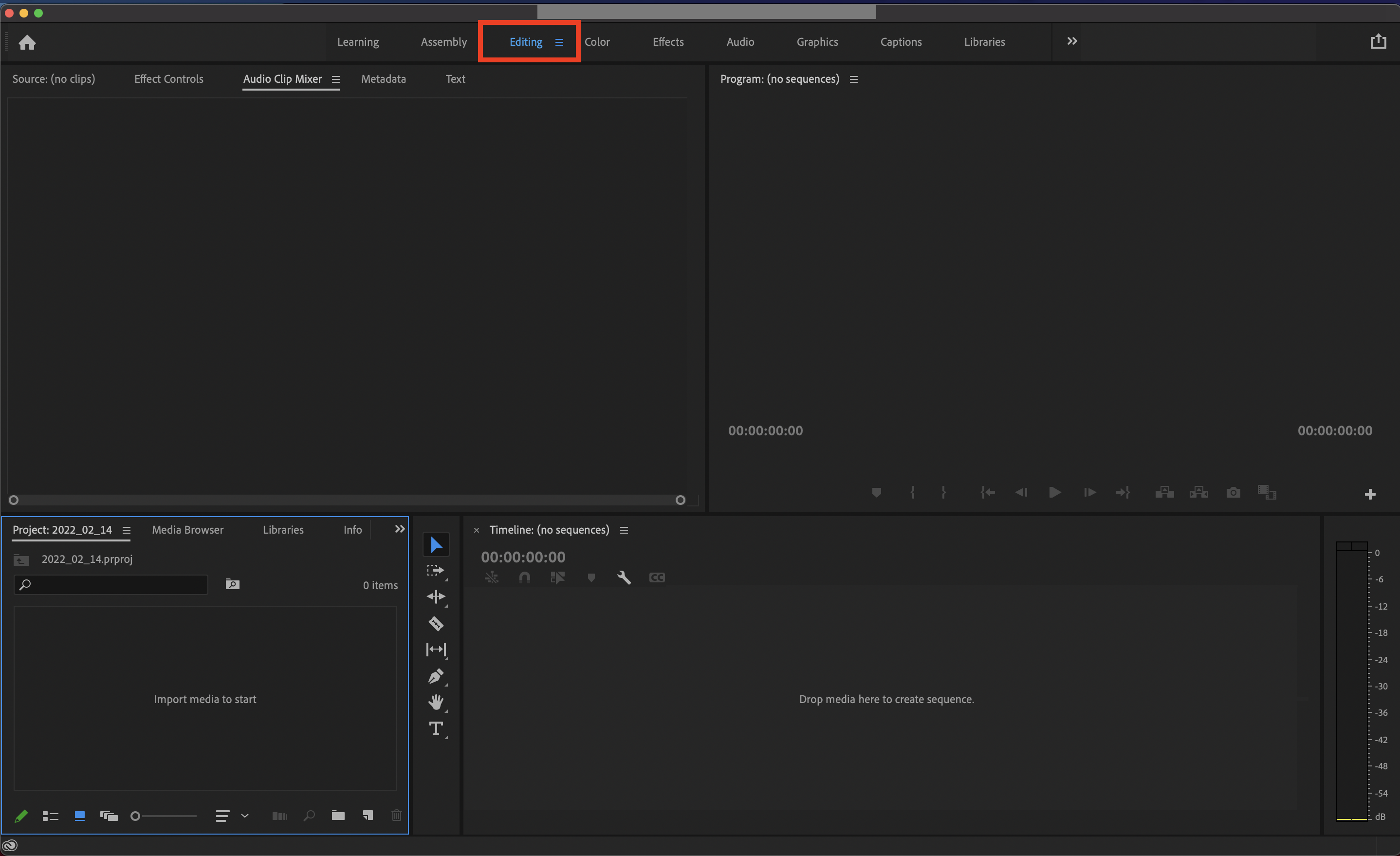 ▼ 아래와 같이 프리미어 프로 프로젝트가 생성됩니다. 상단에 있는 여러 가지 편집 테마 중에 [Editing]을 이용합니다.