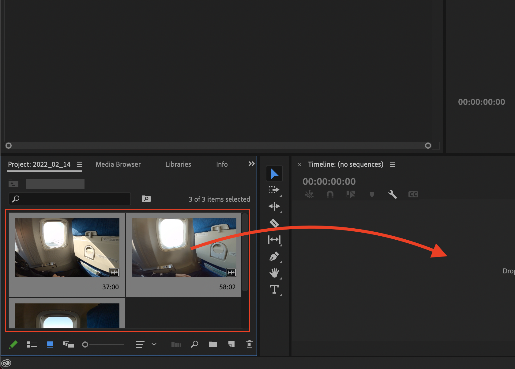 ▼ 영상들이 왼쪽 하단에 있는 프로젝트 패널에 들어가 있는 것을 확인할 수 있습니다. 이제 이 영상들을 타임라인으로 끌어다 놓아(Drag & Drop)주면 됩니다.