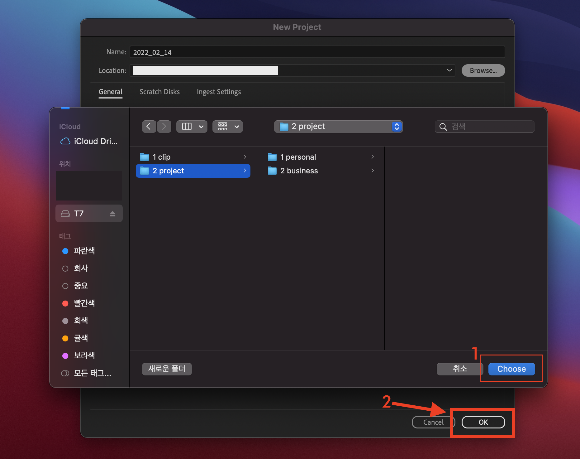 ▼ 영상 작업물을 저장해놓을 위치를 지정해준 뒤 [Choose]를 누르고, 창이 사라지면 [OK]를 누릅니다.