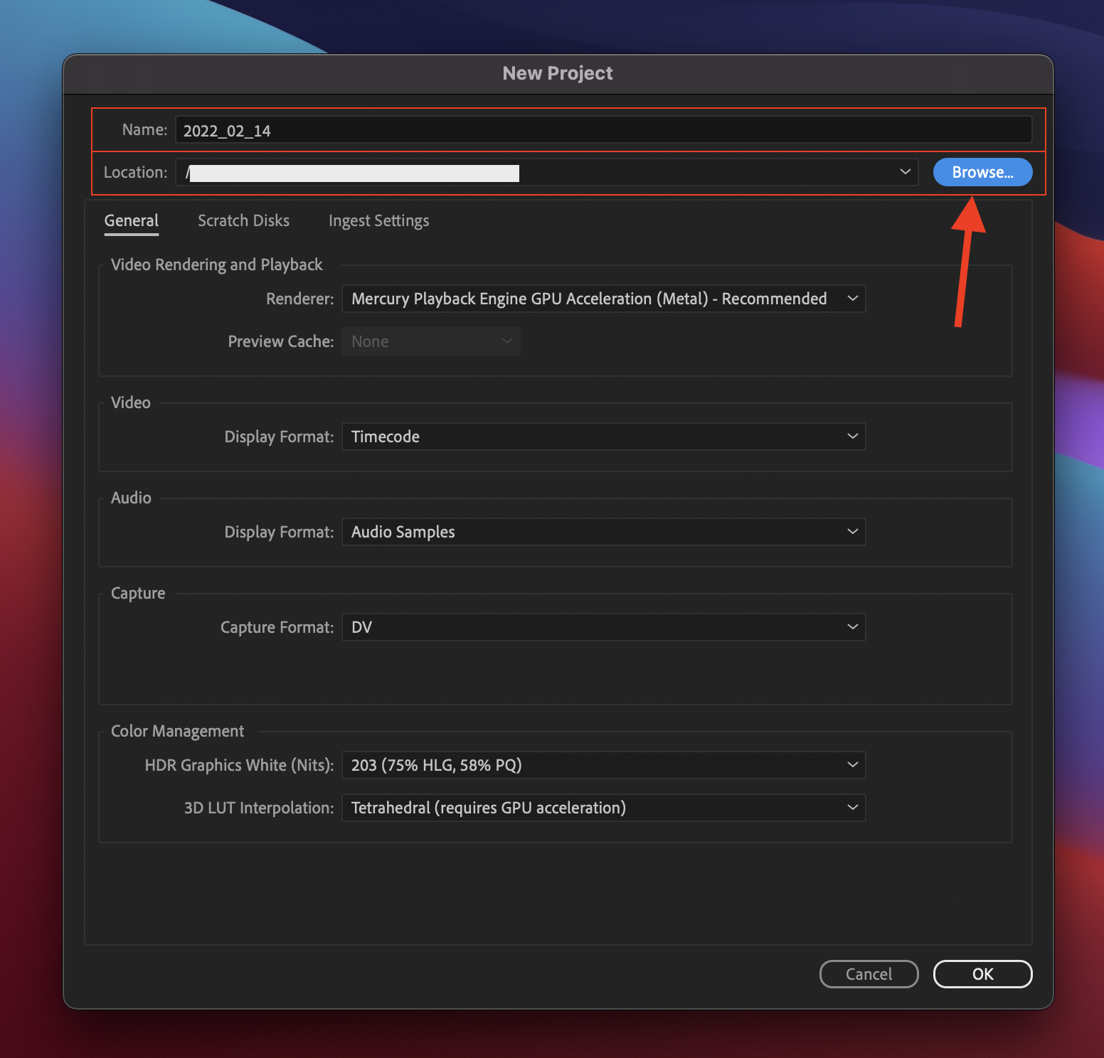 ▼ 프로젝트의 이름(Name)과 저장 장소(Location)를 지정해줍니다. 저장장소를 지정해주기 위해서는 오른쪽에 Browse 버튼을 눌러 영상작업을 저장할 위치를 선택해줍니다.
