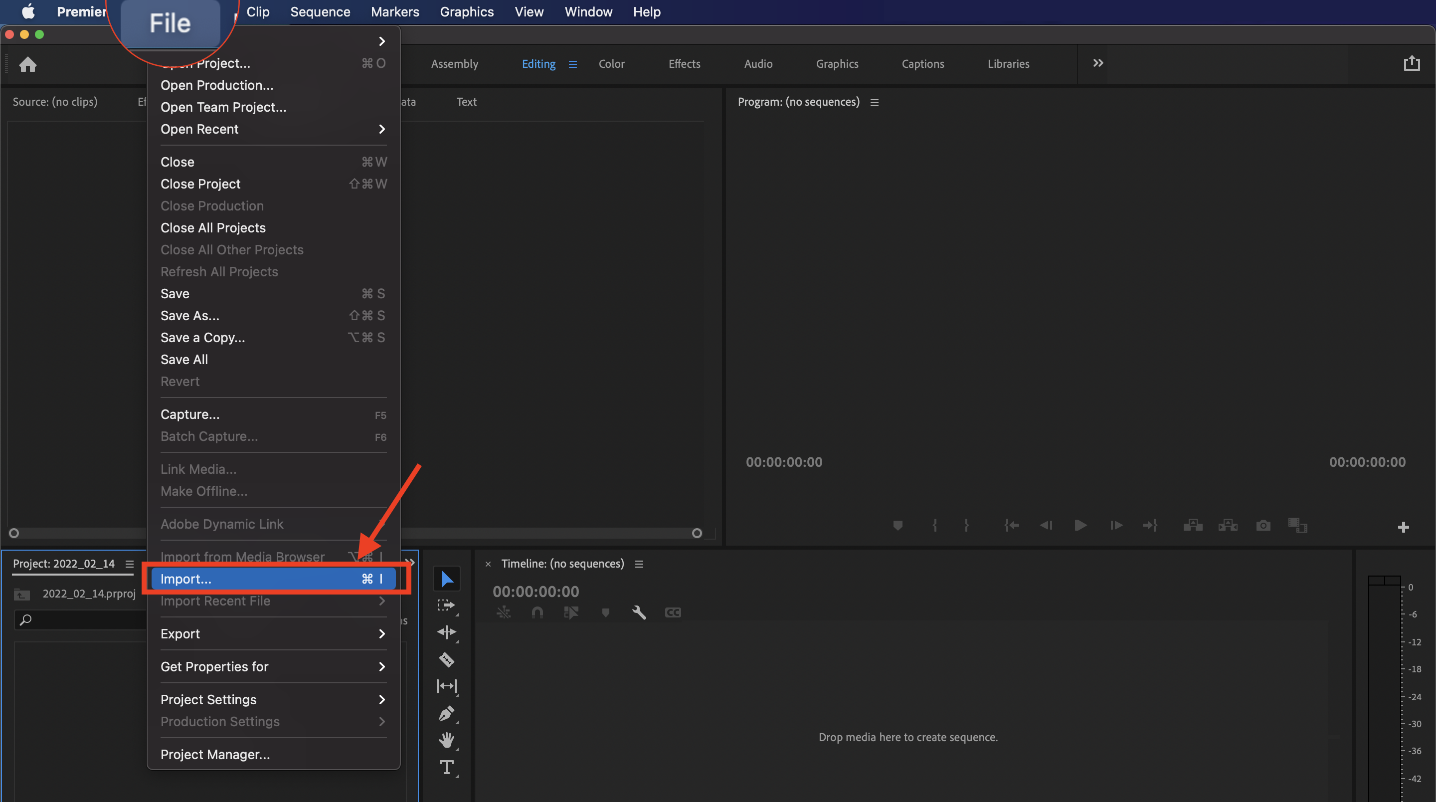 ▼ 동영상을 편집하기 위해서 촬영한 영상을 프로젝트에 넣어보겠습니다. [File] - [Improt] 를 차례로 선택합니다. (단축키는 ctrl + I 혹은 command + I )