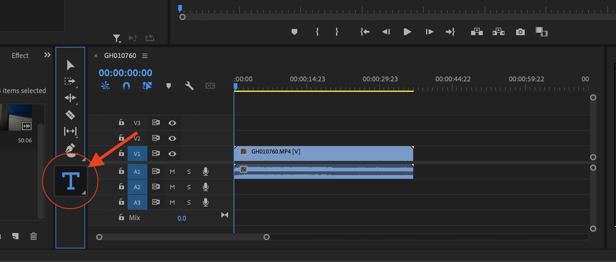 ▼ 타임라인 왼쪽에 있는 메뉴 중에 T 라고 적힌 Text 메뉴를 선택합니다. 텍스트 도구 선택 단축키 : T