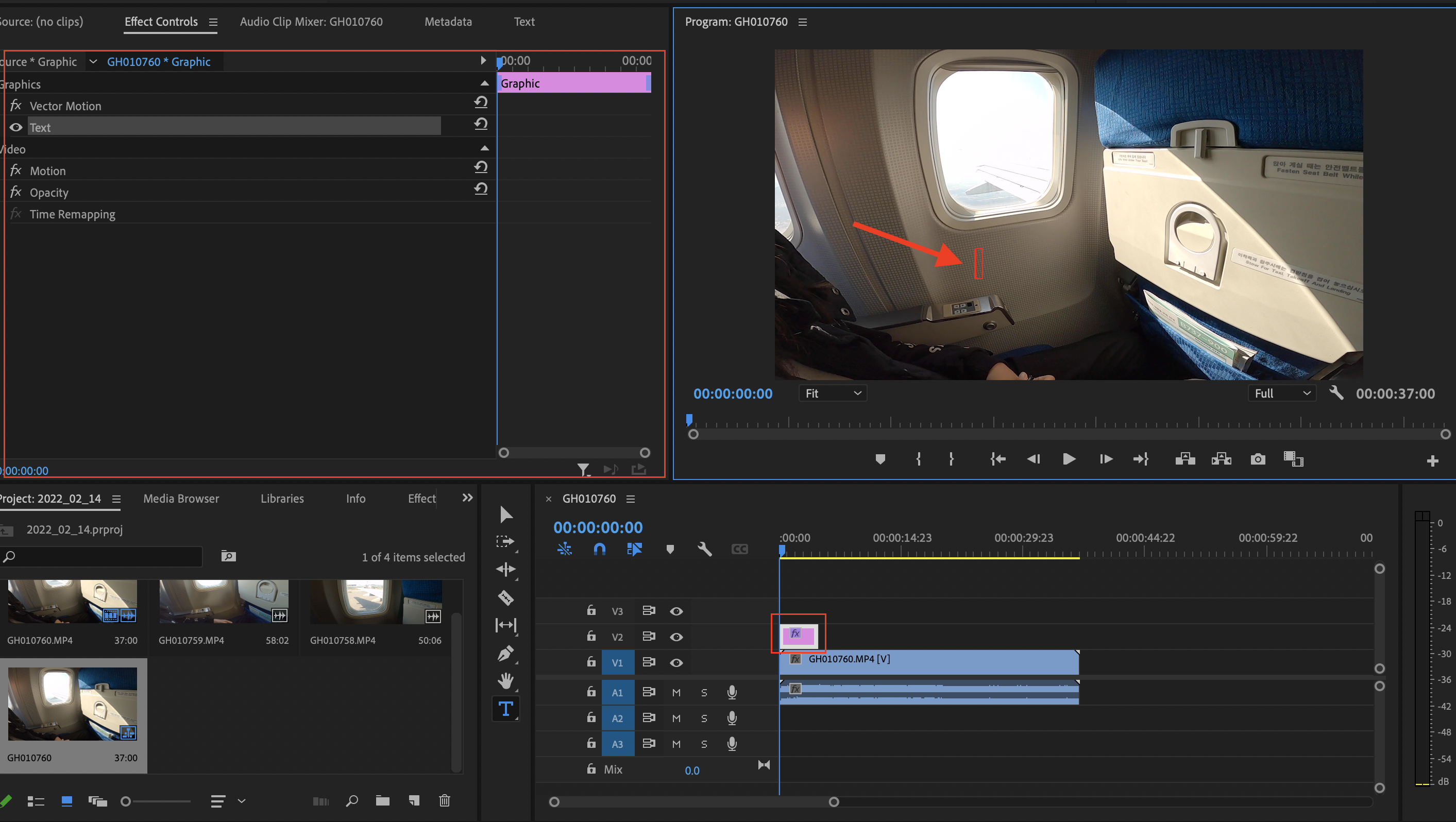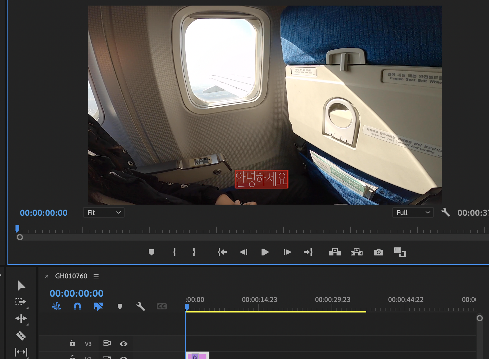 ▼ 그리고 영상 위, 자막 넣을 곳에 클릭합니다. 그러면 아래와 같이 이펙트 패널이 생기고, 타임라인에도 텍스트 클립이 생깁니다.