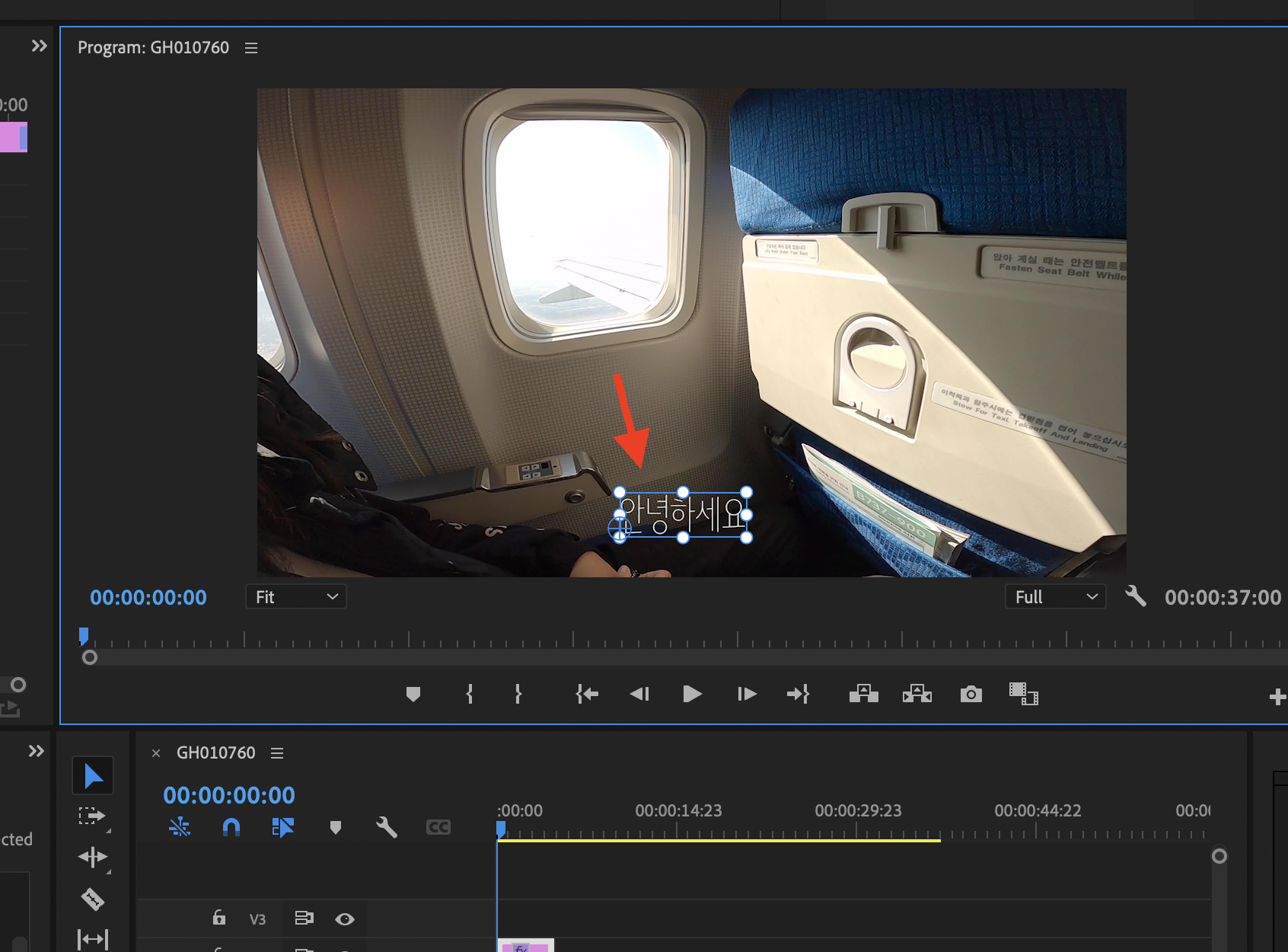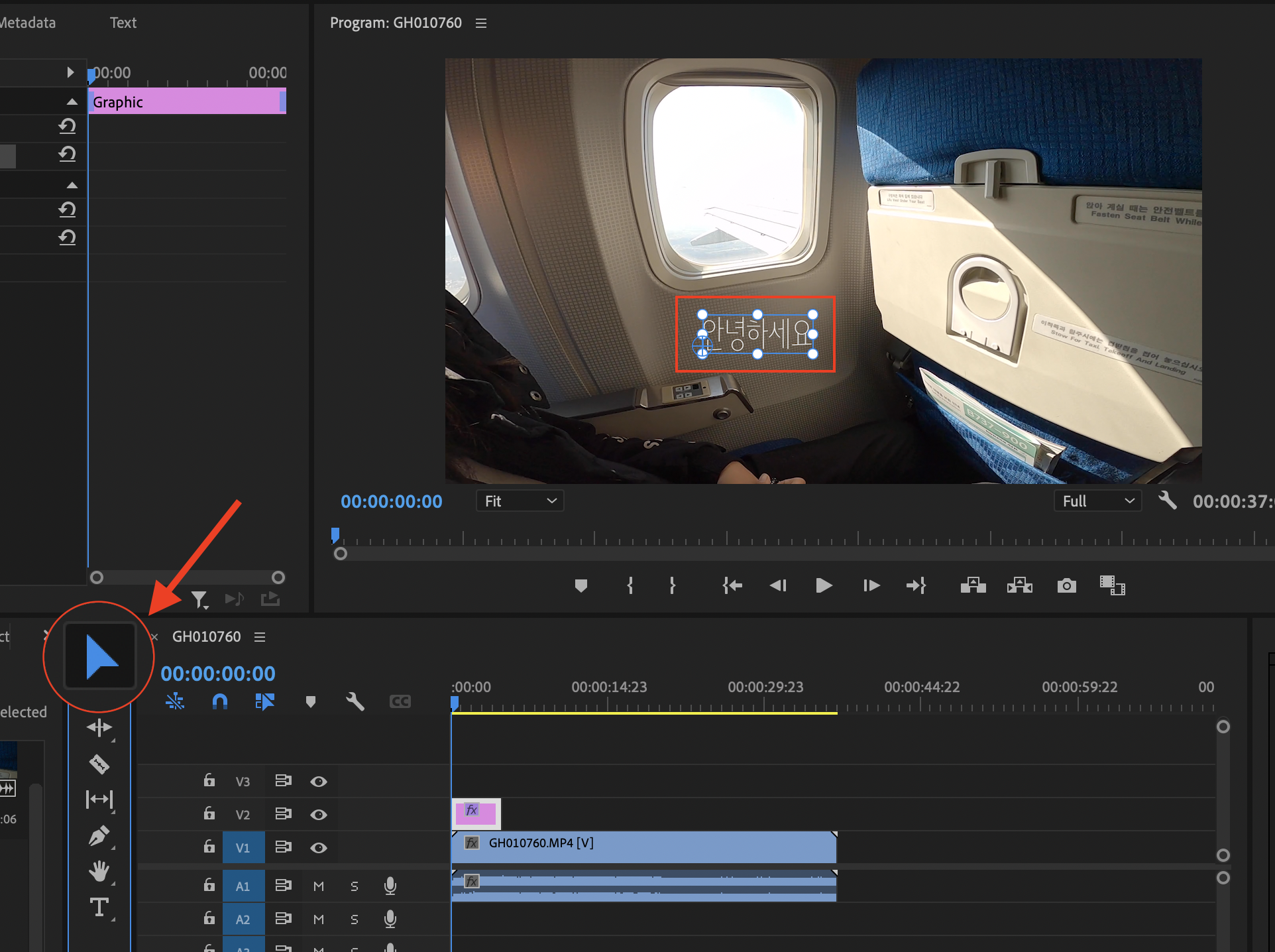 ▼ 글자를 다 적은 뒤에는 반드시 타임라인 옆에 있는 선택 툴을 눌러줍니다. 그러면 텍스트 박스 테두리가 파란색으로 변합니다. 이렇게 되어야만 텍스트 박스를 이동하거나 편집할 수 있습니다.
