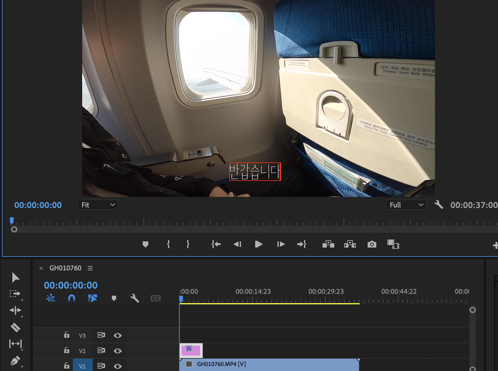 ▼ 그리고 영상 위, 자막 넣을 곳에 클릭합니다. 그러면 아래와 같이 이펙트 패널이 생기고, 타임라인에도 텍스트 클립이 생깁니다.