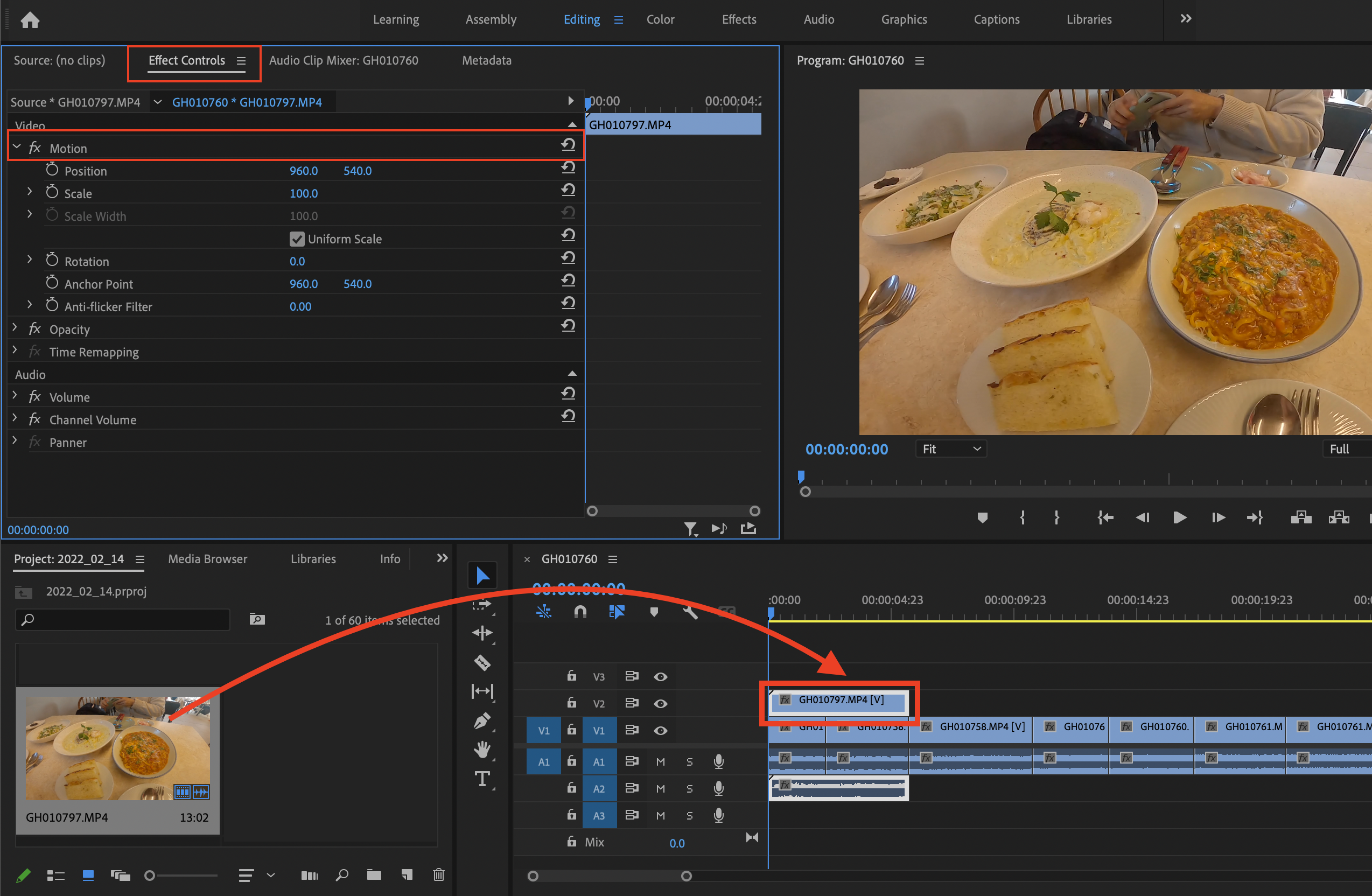 ▼ 올려준 영상이 기존 영상을 가리게 되는데요. 여기서 새로 올려준 클립을 선택하면 아래와 같이 이펙트 패널(Effect Contrls)이 열리게 됩니다. 여기서 [ Fx Motion]을 열어줍니다.