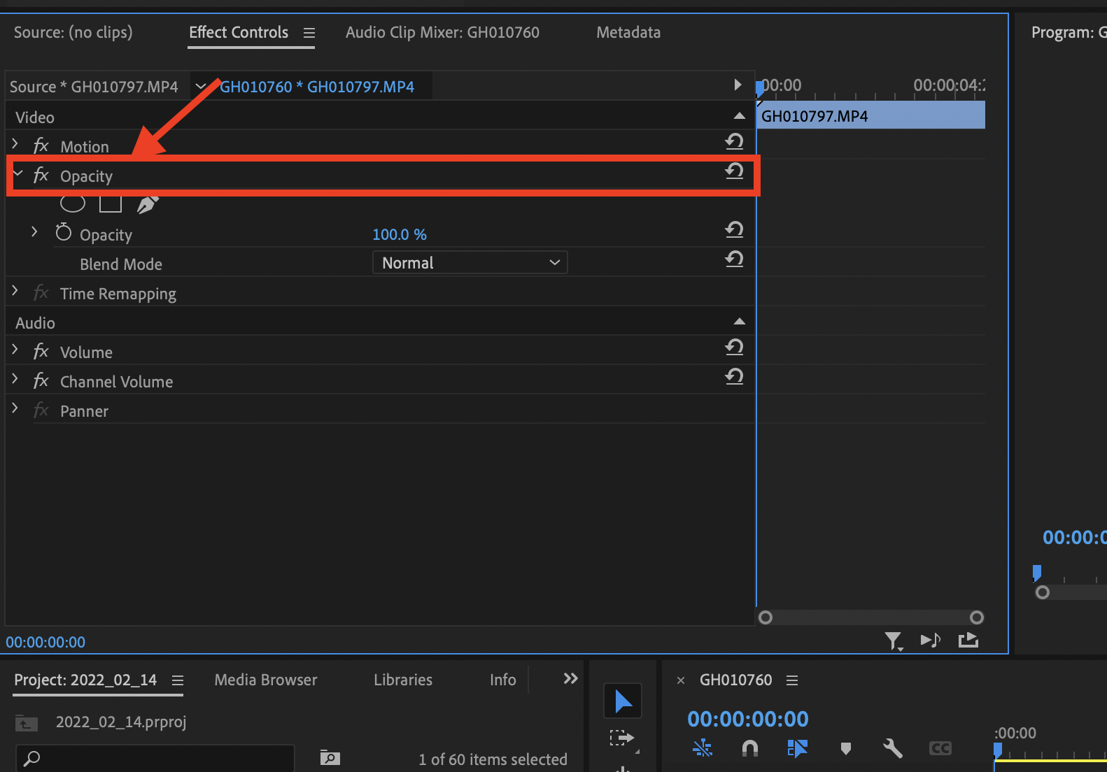 ▼ 이펙트 컨트롤 (Effect Controls) 창에 아래와 같은 화면이 나오는데 거기서 Fx Opacity 를 선택합니다. (왼쪽에 화살표를 클릭)