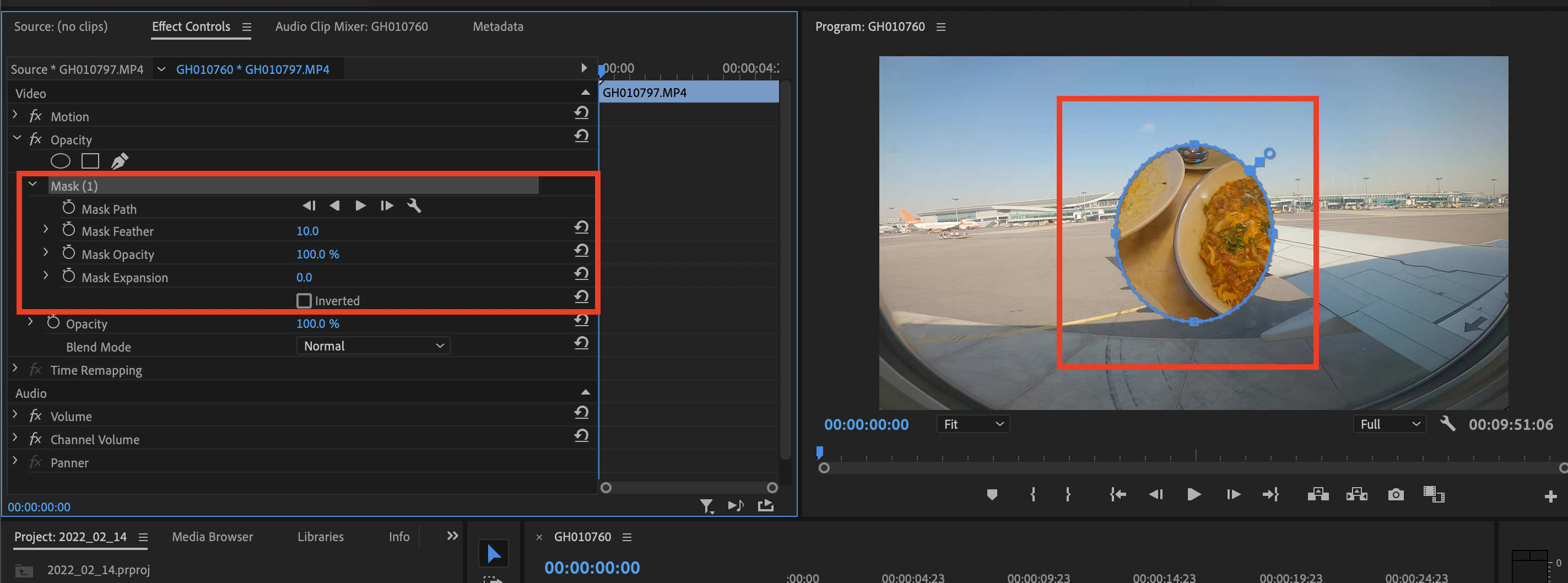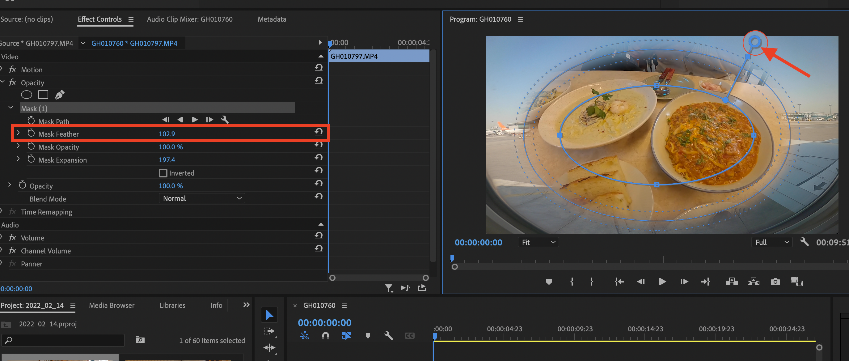 ▼ 테두리 선을 선명하게 혹은 흐리게 하고 싶을 때에는 원 밖에 있는 동그라미를 끌어당기거나, 왼쪽 Mask Feather 값을 조절해주면 됩니다.