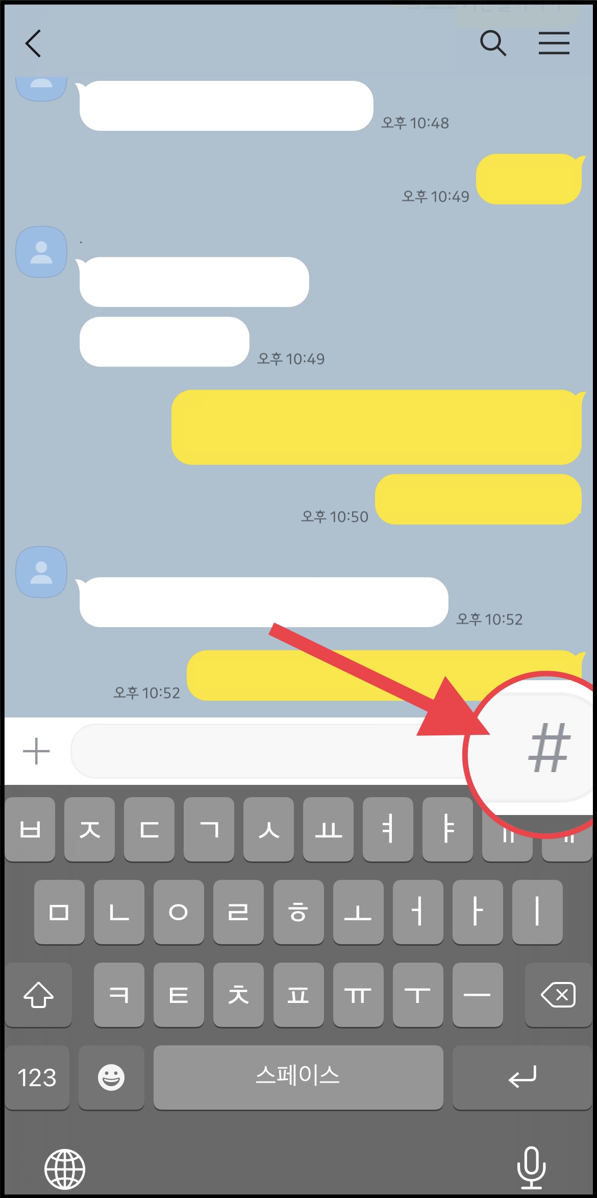 ▼ 카카오톡 채팅창에 들어가면 메세지 입력란 오른쪽에 샵(#) 버튼이 있습니다.