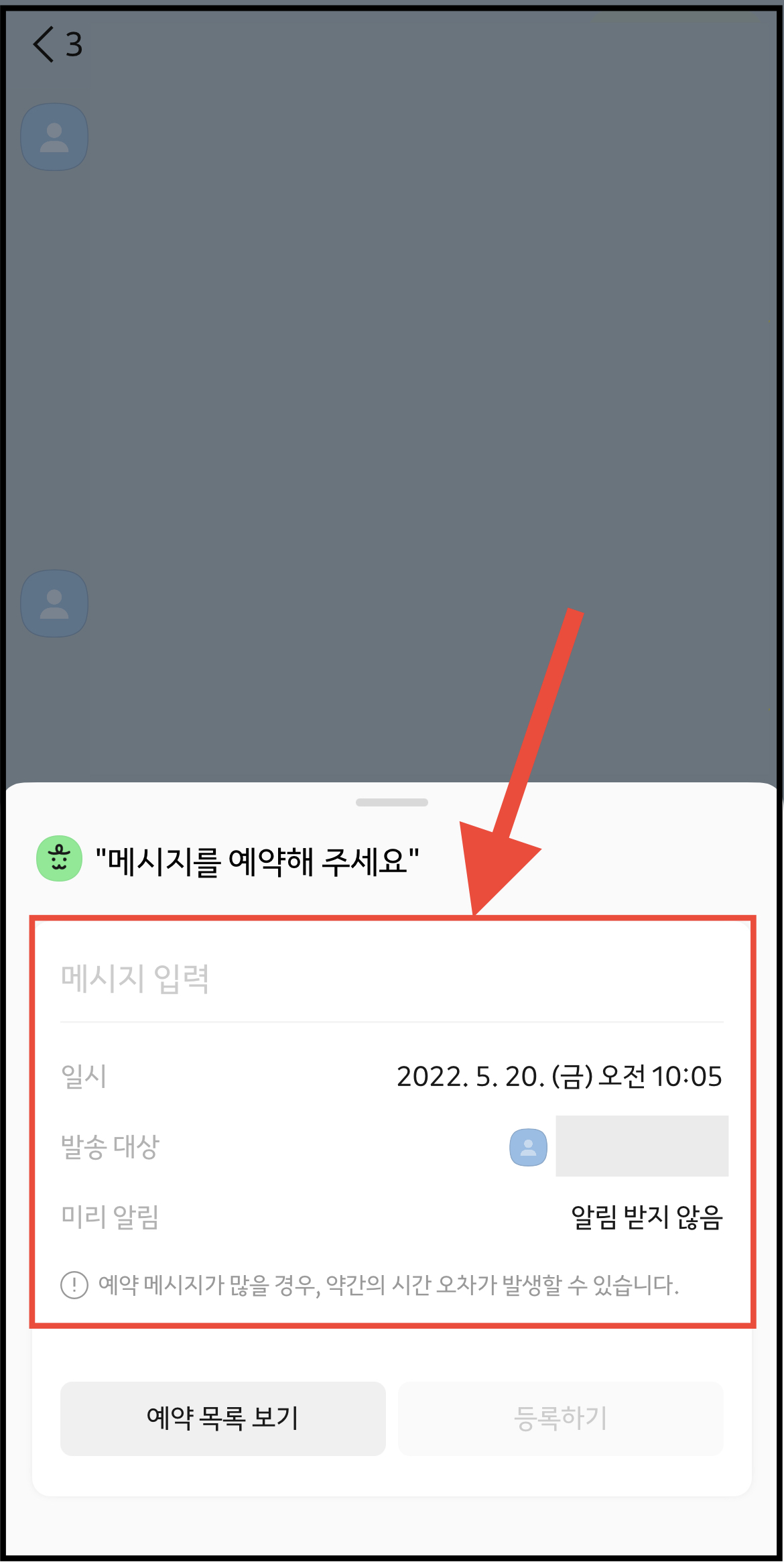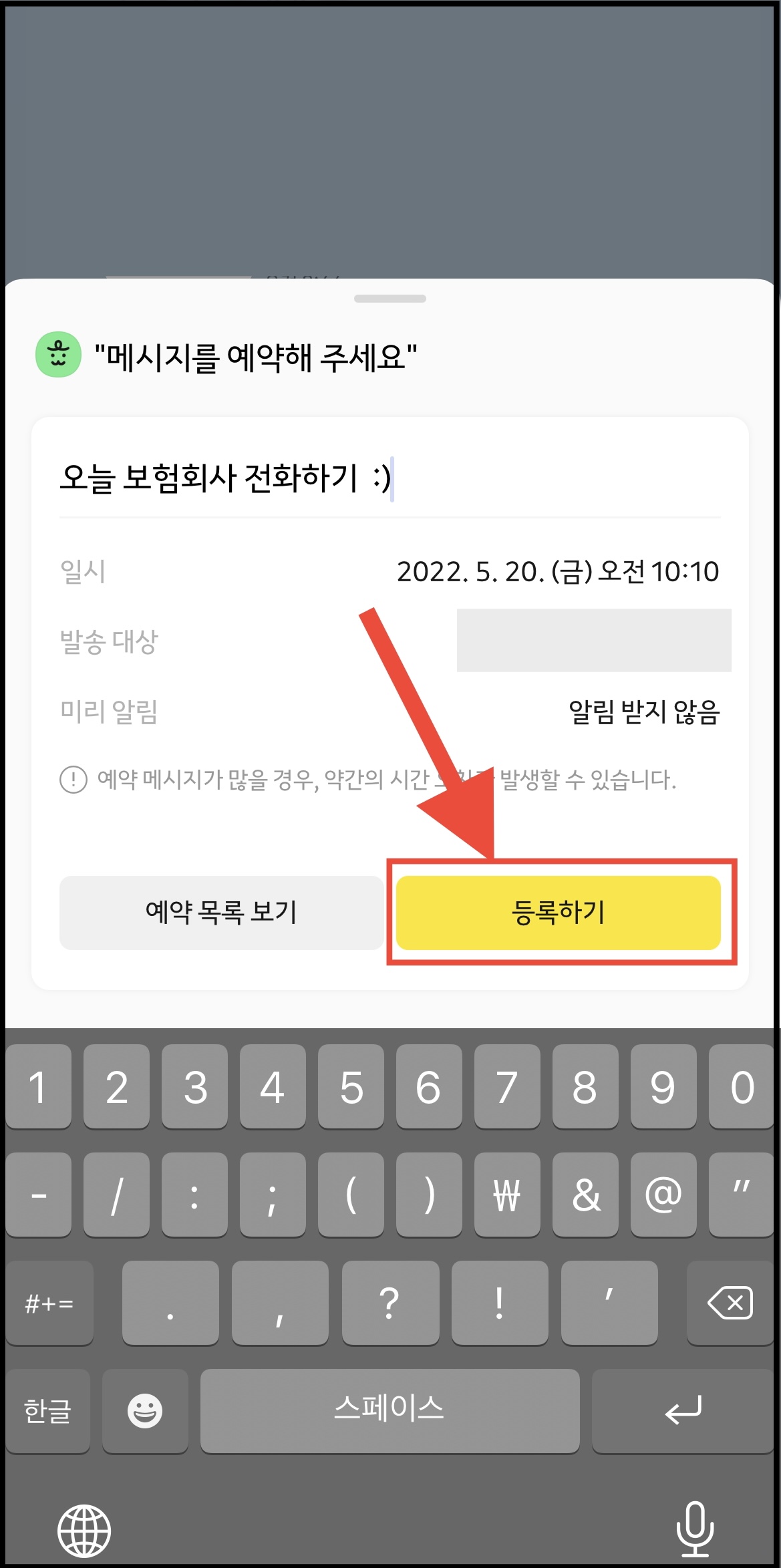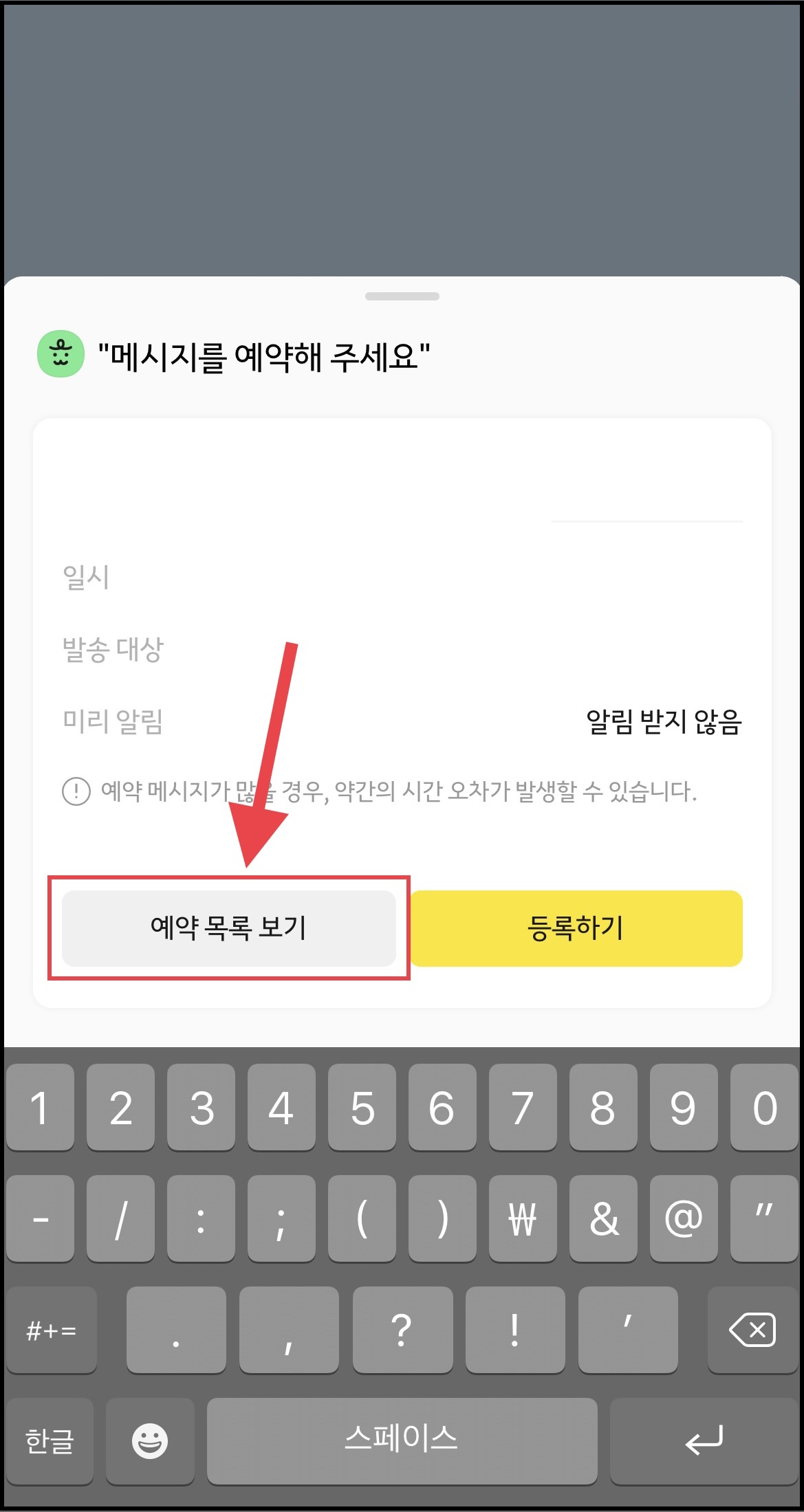 ▼ 메시지를 보낼때와 마찬가지로 들어간 후 [예약 목록 보기]를 누르면 됩니다.
