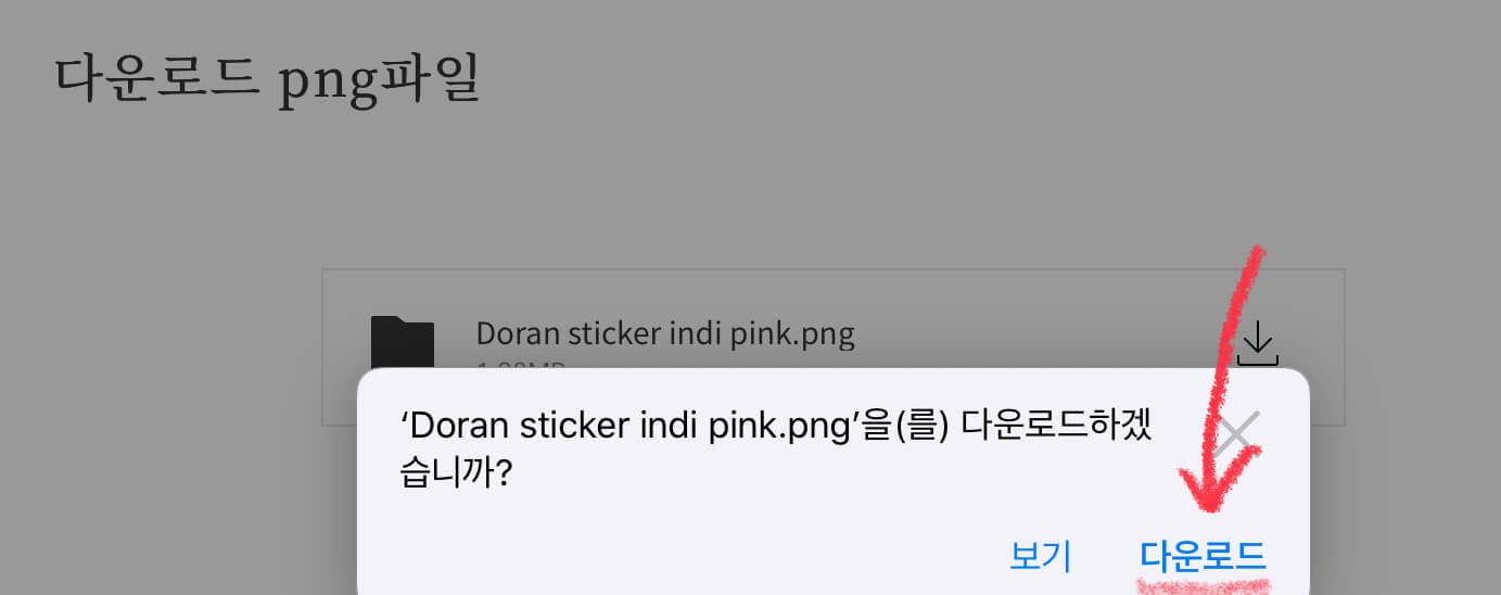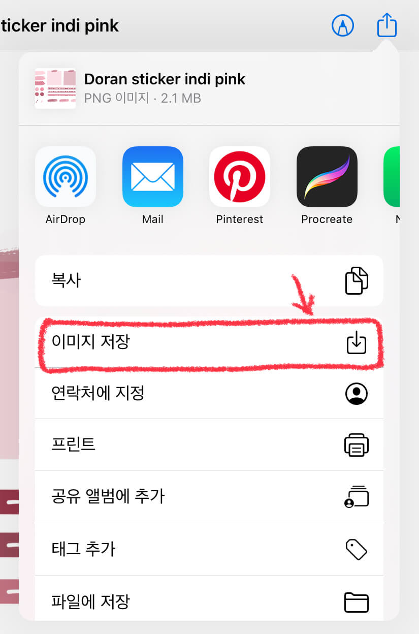 이미지 저장을 해주면, png 스티커 파일이 사진첩에 저장이 됩니다.