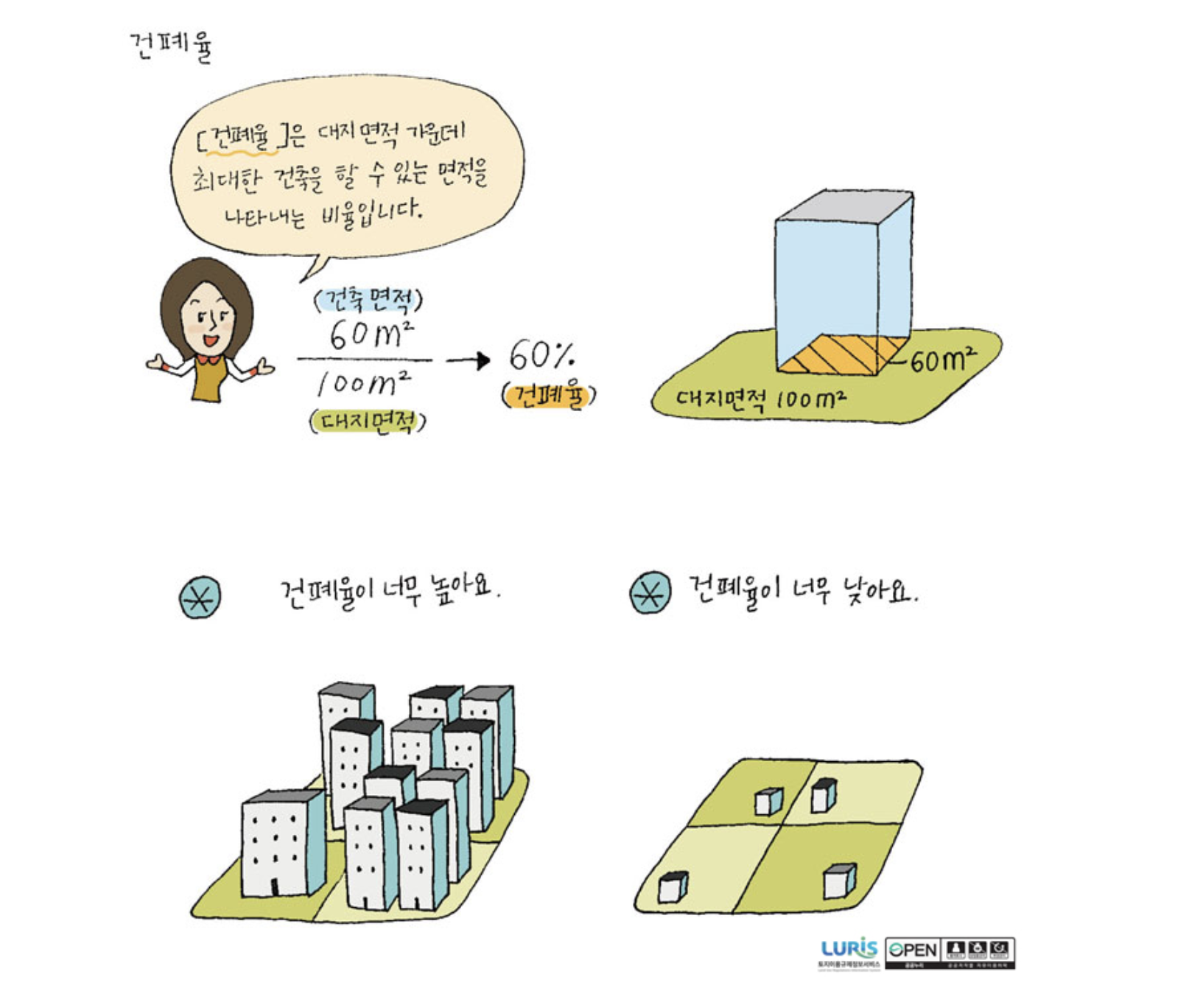 건폐율은 대지면적에 대한 건축면적의 비율의 말한다. 즉 땅에 지을 수 있는 건물의 바닥 면적 비율을 말한다. 건폐율이 40%일 경우, 땅이 100평이면 40평 넓이 이하로 건축을 지을 수 있다.