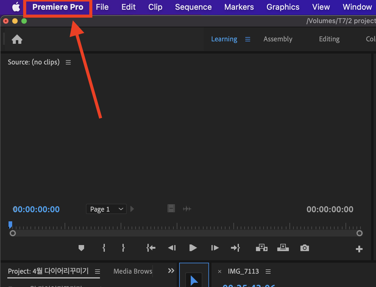 ▼ 바로 왼쪽 상단에 있는 [Premiere Pro] 메뉴를 선택합니다.