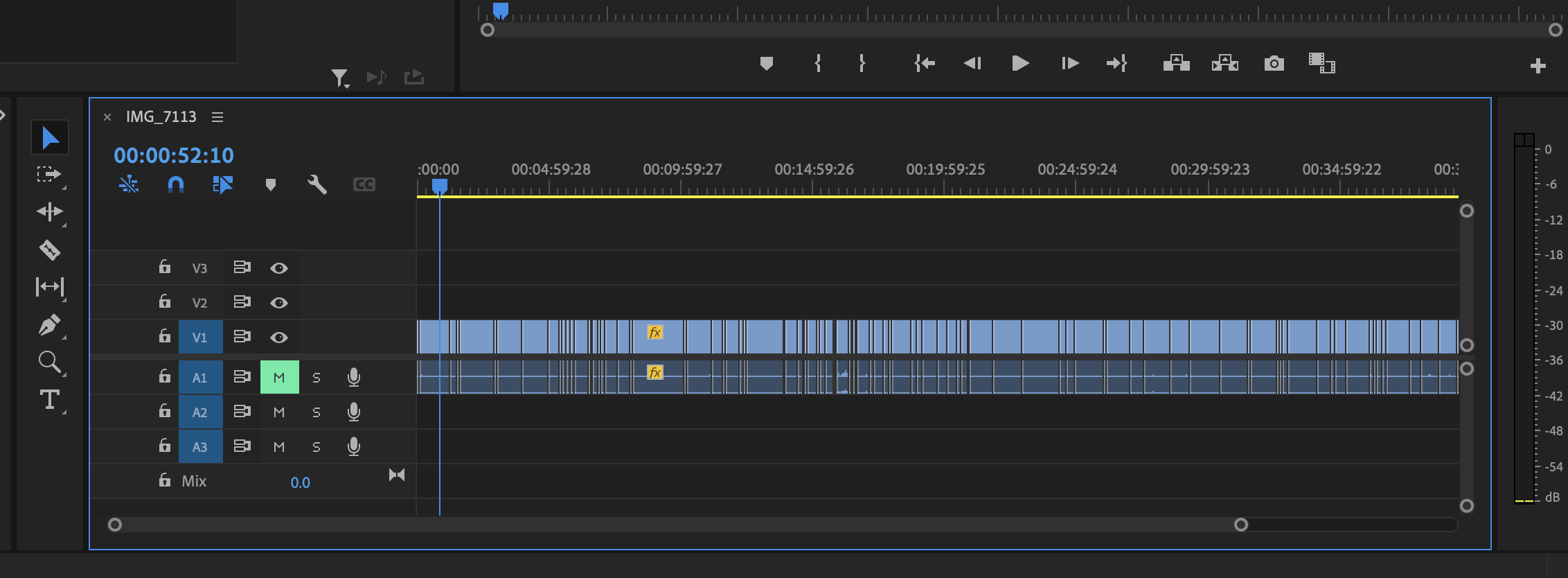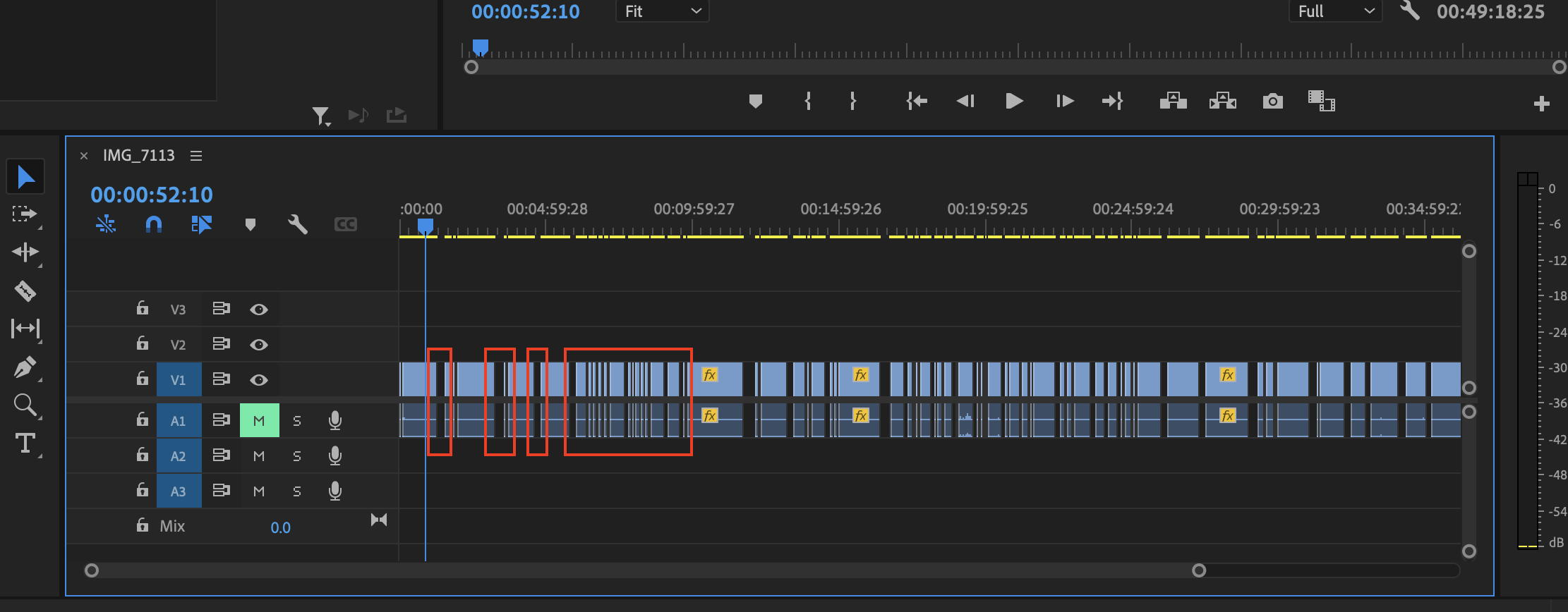 프리미어 프로에서 영상 전체의 속도를 줄이게 되면 아래와 같이 잔물결이 엄청(?) 많아집니다. 이 빈 공간을 한꺼번에 없애는 방법을 적어보겠습니다. (초간단!)