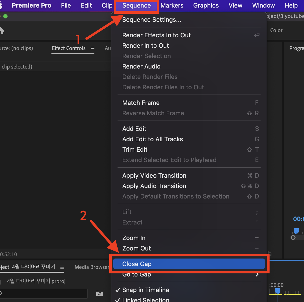 ▼ 상단 메뉴 중 [Sequence 시퀀스] 를 누르고, 아래에 있는 [Close Gap] 을 선택합니다.
