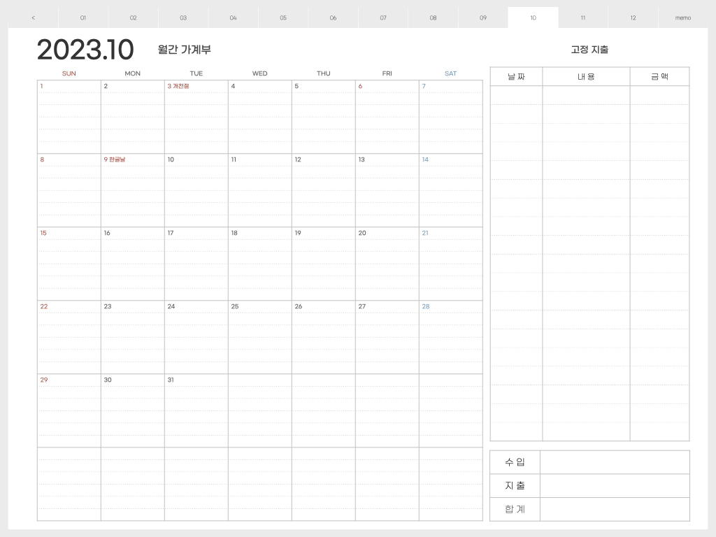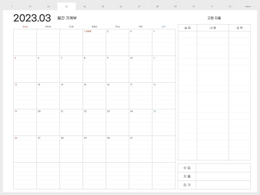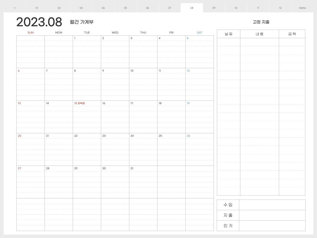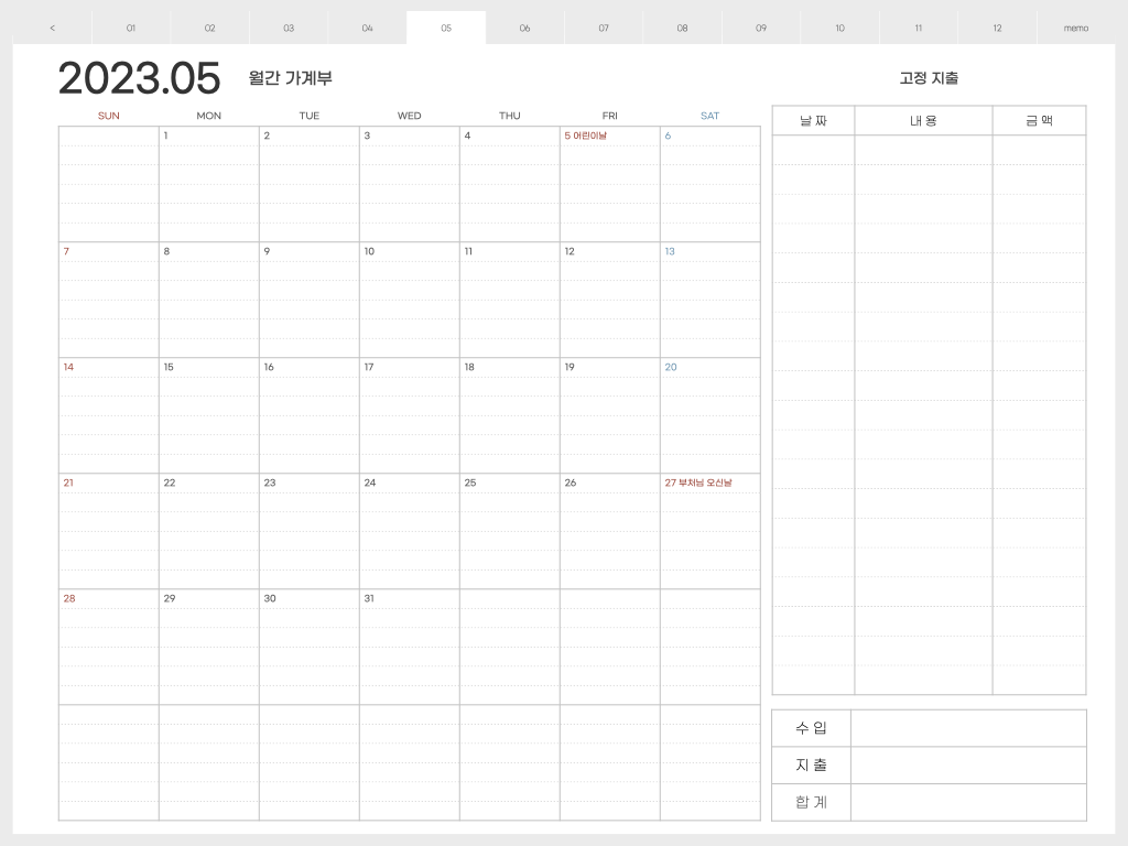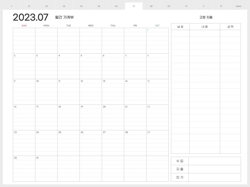 월간 가계부는 총 6주로 되어있고, 일요일부터 시작합니다. 오른쪽에는 고정지출들을 적어놓을 수 있습니다. 아래에는 총 수입과 총지출을 계산해서 합계를 적을 수 있습니다.
