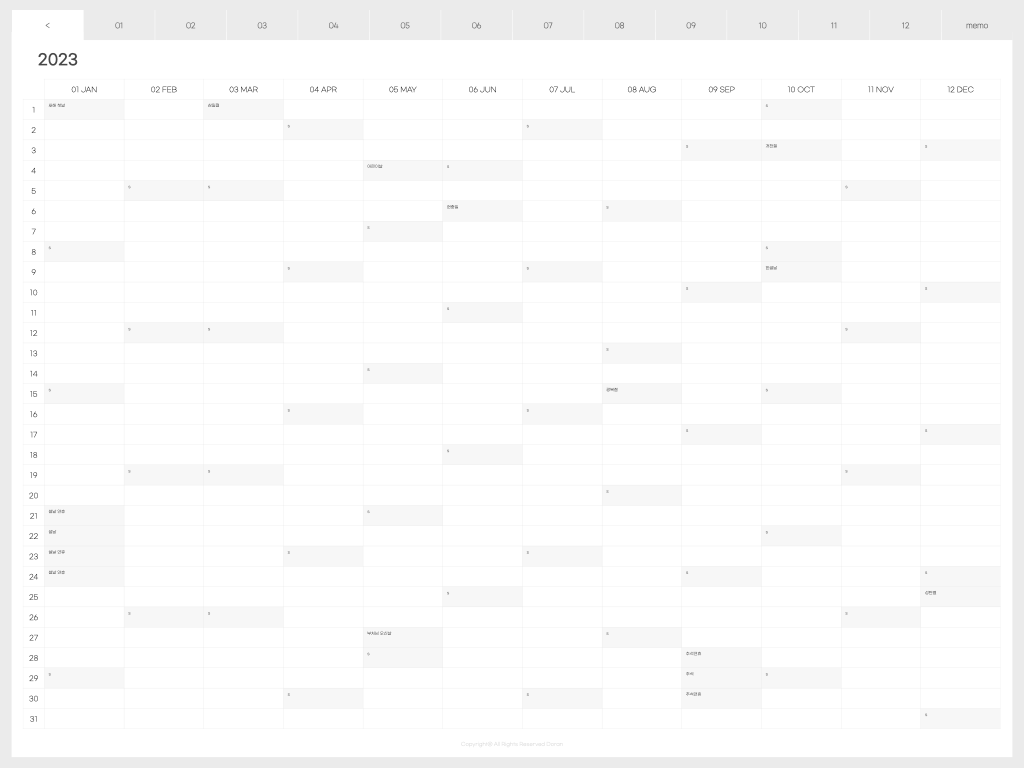 앞표지는 2022년과 마찬가지로 심플하게 숫자와 글자만 들어갔고요, 다음 페이지에는 1년을 한눈에 볼 수 있는 페이지가 들어가 있습니다. 가장 마지막 페이지는 빈칸으로 해두었습니다.