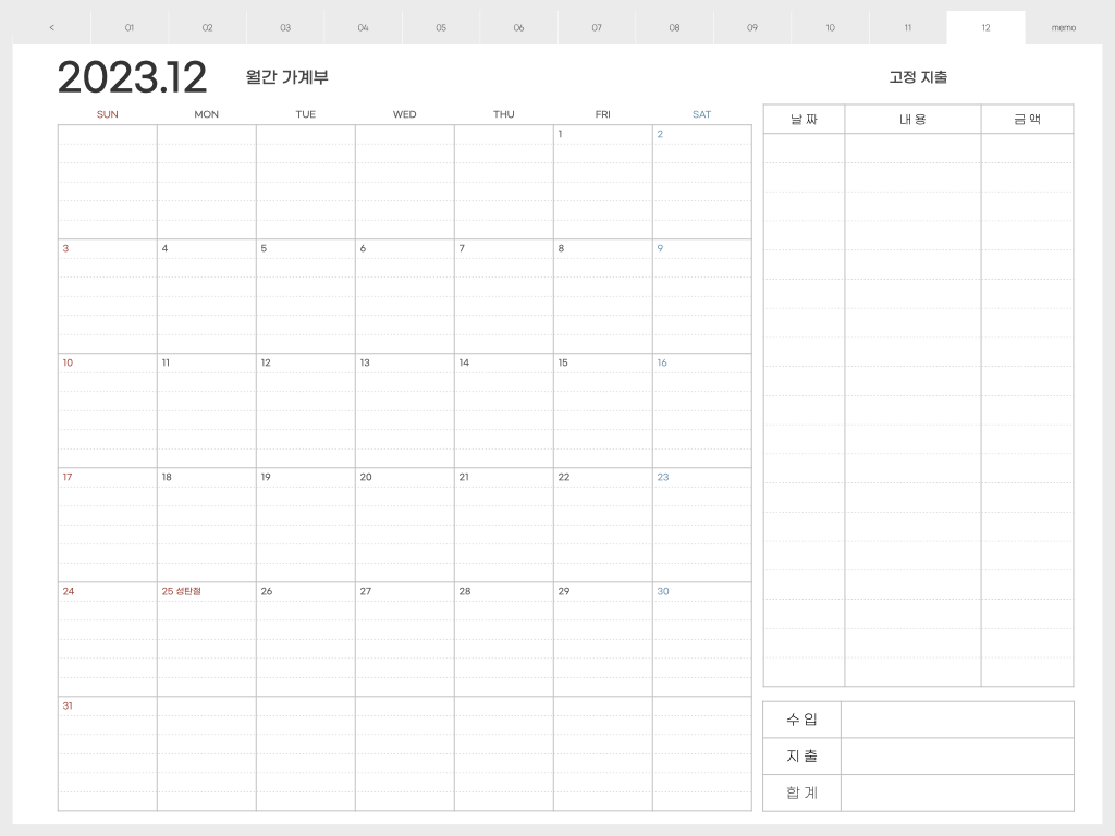 월간 가계부 페이지는 날짜만 다르고 모두 같은 디자인으로 되어있습니다. 사용된 폰트는 모두 G마켓산스 입니다.
