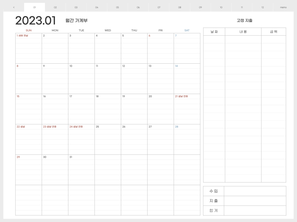 월간 가계부 페이지는 날짜만 다르고 모두 같은 디자인으로 되어있습니다. 사용된 폰트는 모두 G마켓산스 입니다.
