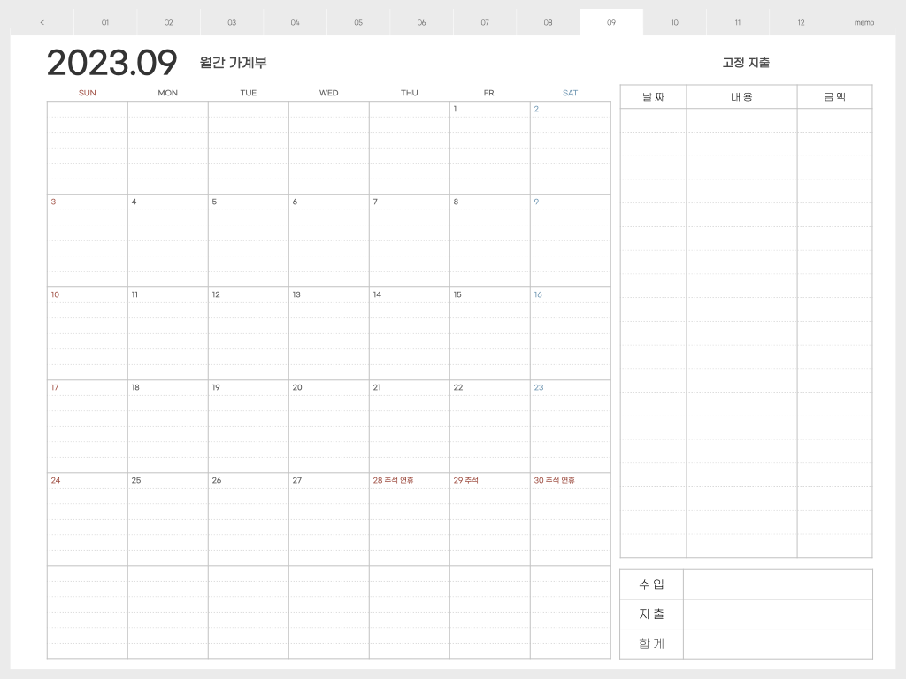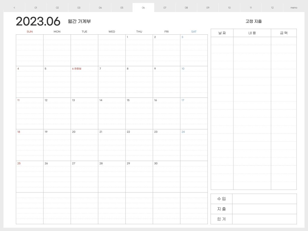 월간 가계부는 총 6주로 되어있고, 일요일부터 시작합니다. 오른쪽에는 고정지출들을 적어놓을 수 있습니다. 아래에는 총 수입과 총지출을 계산해서 합계를 적을 수 있습니다.