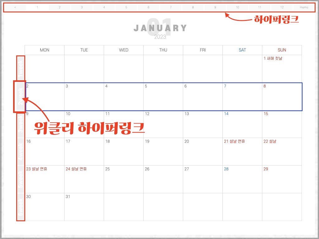 일요일부터 시작하는 속지는 왼쪽에 있는 week(두꺼운 빨간색 네모)를 누르면 해당하는 주의 월요일부터 일요일(파란색 네모)로 이동하게 됩니다. 즉 같은 줄에 있는 월요일부터 다음 줄에 있는 일요일까지로 이동하게 됩니다. (먼슬리는 월요일 시작과 일요일 시작이 다르지만 위클리 속지는 동일하기 때문입니다.)